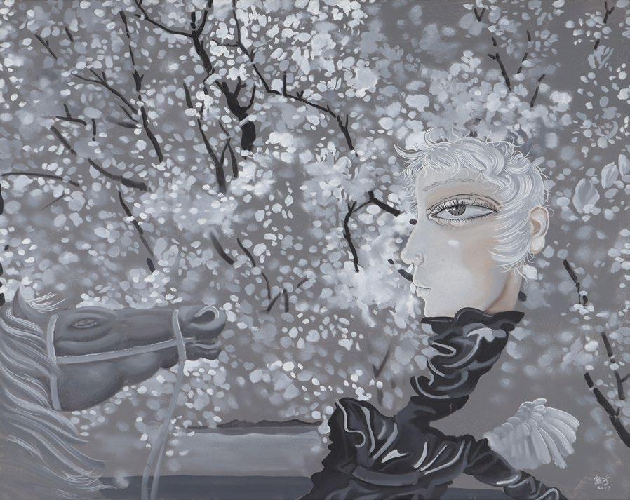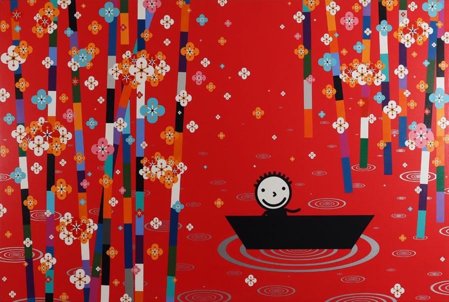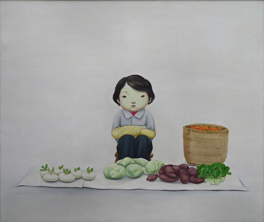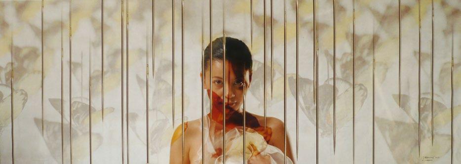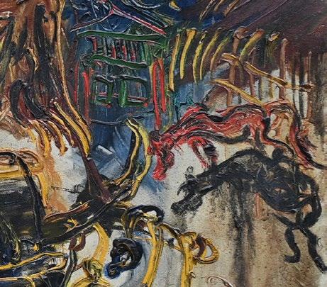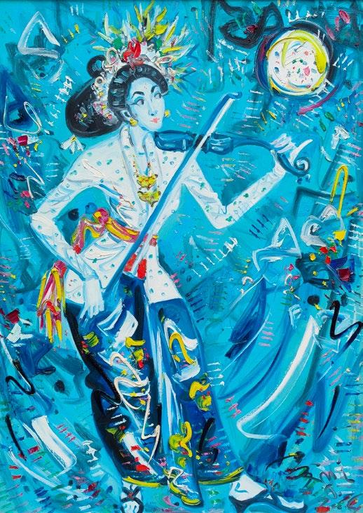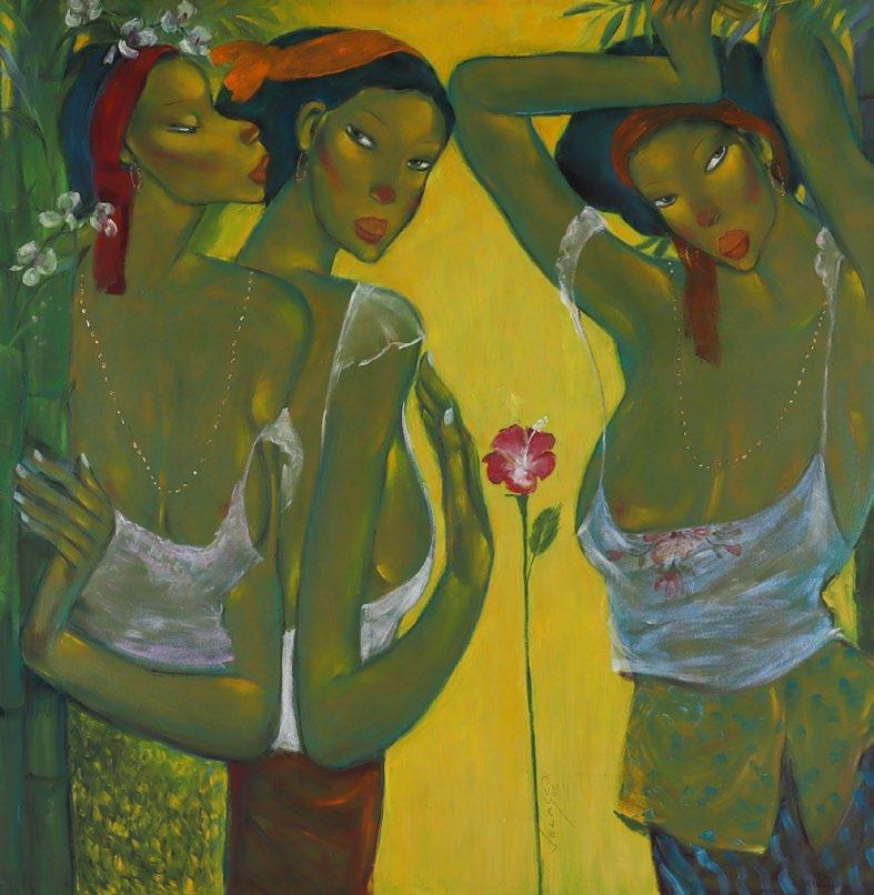 Widely acclaimed for his signature impressionist landscapes, his en plein air paintings uniquely employ golden halos that render an ethereal atmosphere where light forms the visual focal point of his composition. In "Going to Temple", Choo captures the moment when morning rays filter through tree branches, highlighting the graceful beauty of Balinese architecture, people, and culture.