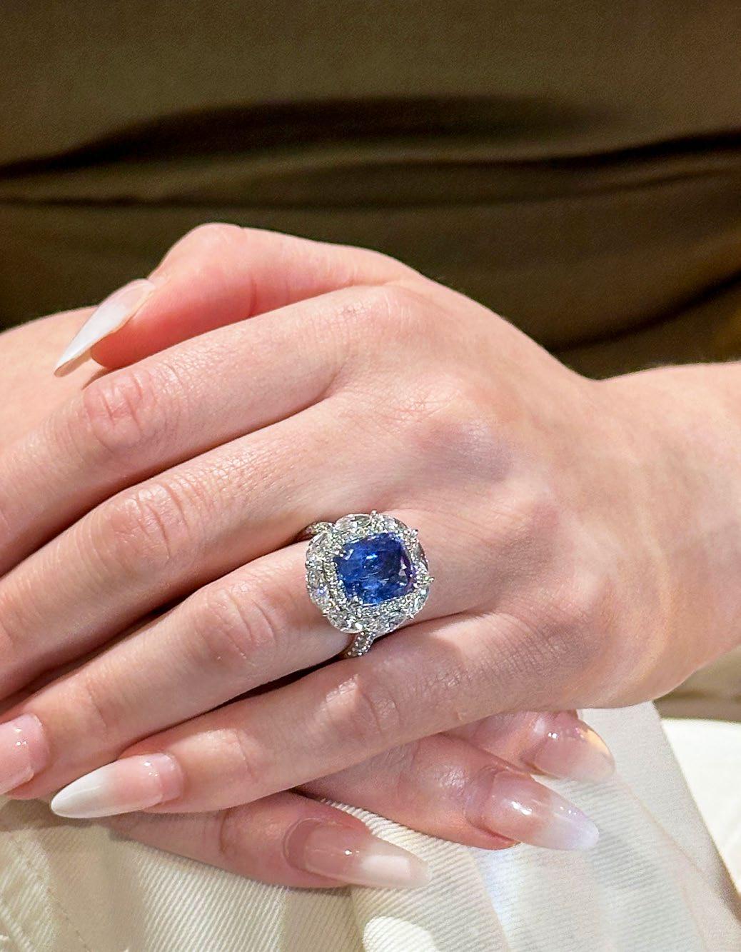 Burmese Royal Blue Sapphire Ring A bold expression of elegance and strength, this striking ring features a luxurious perfect 5.38 carat royal blue Burmese sapphire, celebrated for its rich, velvety hue and exceptional depth. The cushion-cut centerpiece is beautifully framed by a dynamic floral halo of 2.25 carats of marquise and pear-shaped diamonds each expertly placed to enhance brilliance and create a captivating silhouette. Set in gleaming platinum, this piece harmoniously blends regal grandeur with timeless sophistication.