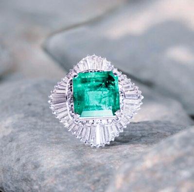 A dazzling revival of vintage glamour, this Art Deco-inspired ring pairs the striking clarity of diamonds with the lush vibrancy of emeralds. At its center, a brilliant 1.43 carat diamond radiates fire and precision, framed by a luminous halo of white diamonds. Bold geometric detailing on the shoulders is brought to life with channel-set emeralds, expertly arranged in sweeping curves that echo classic Art Deco motifs. Crafted in 18K white gold and GIA certified, this piece embodies timeless sophistication with a spirited edge.