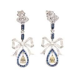 Suspended below each bow is a striking pearshaped blue sapphire, encircled by a shimmering halo of diamonds adding movement, brilliance, and depth.