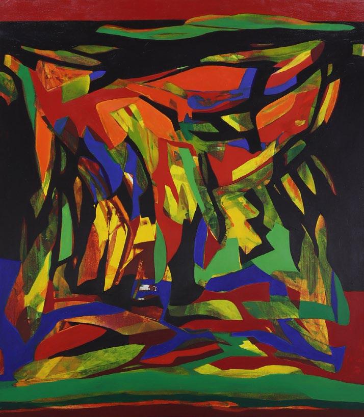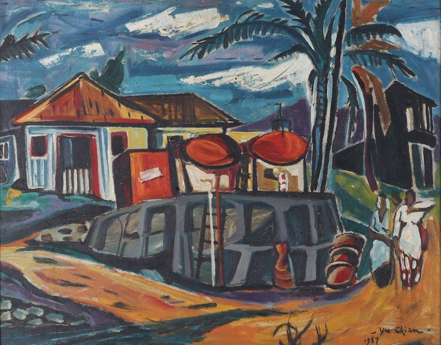 Set against the backdrop of Singapore's rapid urbanisation and kampung resettlements in the 1970s, this lot captures a picturesque memory, conveying the artist’s sentiment for the vanishing kampung way of life. Focusing on quotidian scenes, it portrays residents engaged in domestic chores, attap houses, woven bamboo crafts, and a rhythmically layered tree line rendered in soft yet luminous tones that evoke an idyllic impression. This stands in stark contrast to Singapore’s contemporaneous leap toward a hyper-modern urban landscape.