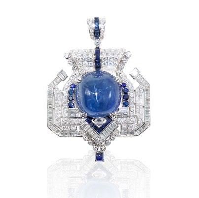 A masterwork of vintage refinement, this exceptional Art Deco brooch showcases a remarkable 75.15 carat no heat Burma sapphire, radiating with velvety royal blue depth and rarity.Certified by GRS, the central cabochon sapphire commands attention with its unenhanced natural beauty an extraordinary find from Myanmar. Framed by a meticulously arranged composition of fine white diamonds and accent sapphires, the design pays homage to the geometric elegance and symmetry of the Art Deco era. A true collector’s piece that transcends time, heritage, and artistry.
