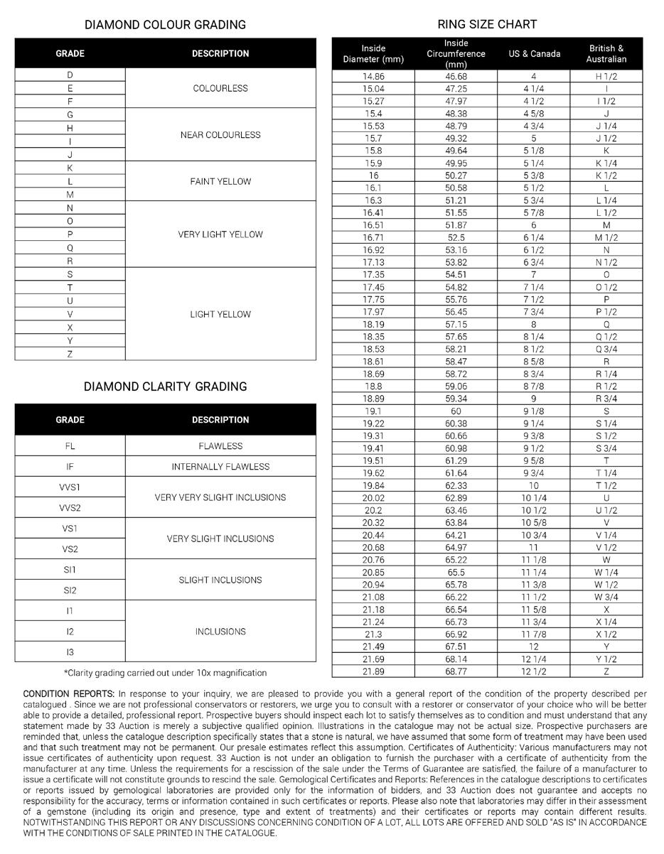 Unless indicated by a box ( ), all lots included in this catalogue are offered subject to a reserve. A reserve is the confidential hammer price established between 33 Auction and the seller and below which a lot will not be sold. The reserve is generally set at a percentage of the low estimate and will not exceed the low estimate for the lot.