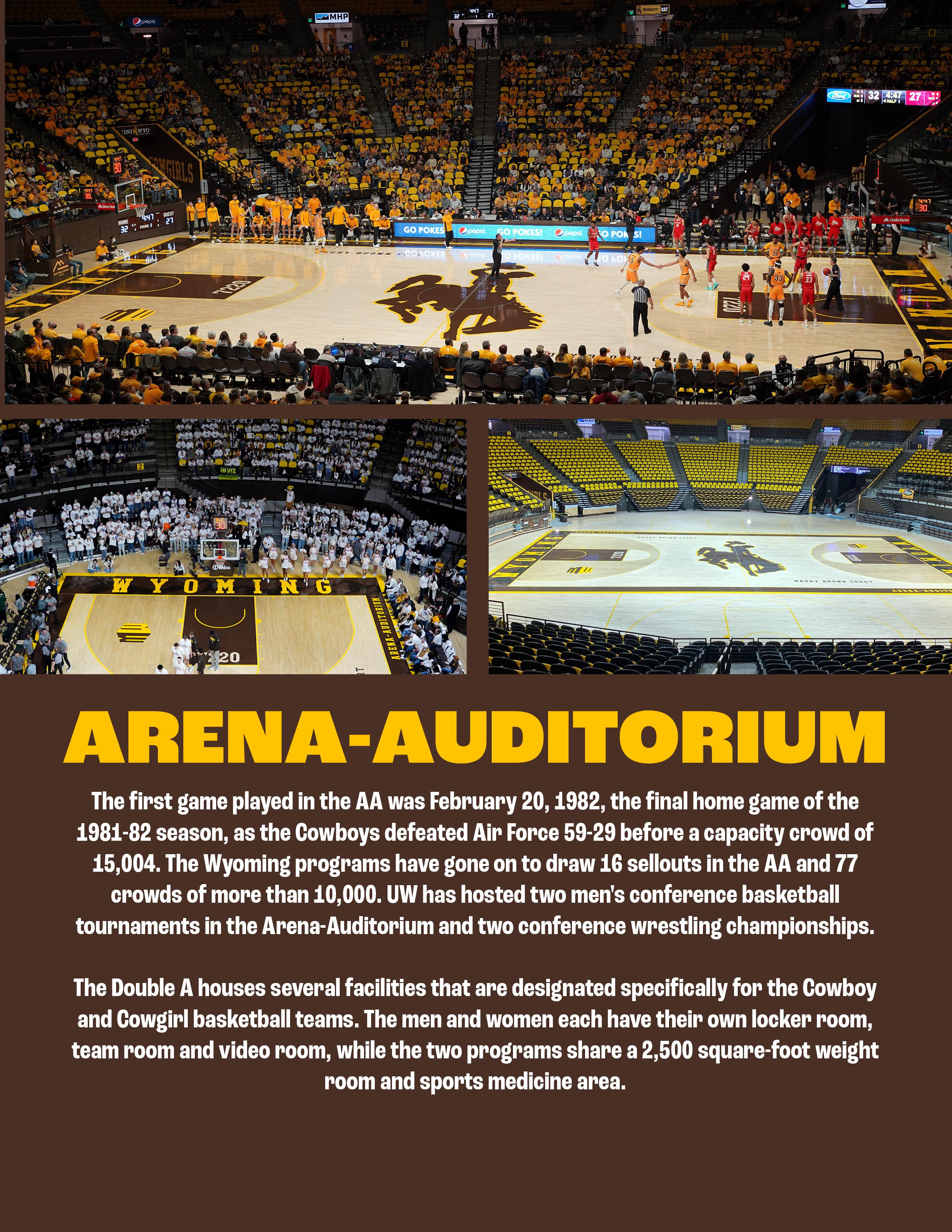 Wyoming’s Arena-Auditorium is located on Willett Drive in Laramie, just north of War Memorial Stadium and the Fieldhouse complex. Media parking is located to the west of the Double A, in the “S” lot. Will Call is located at the Willett West entrance to the Double A, and is open 90 minutes prior to game time.