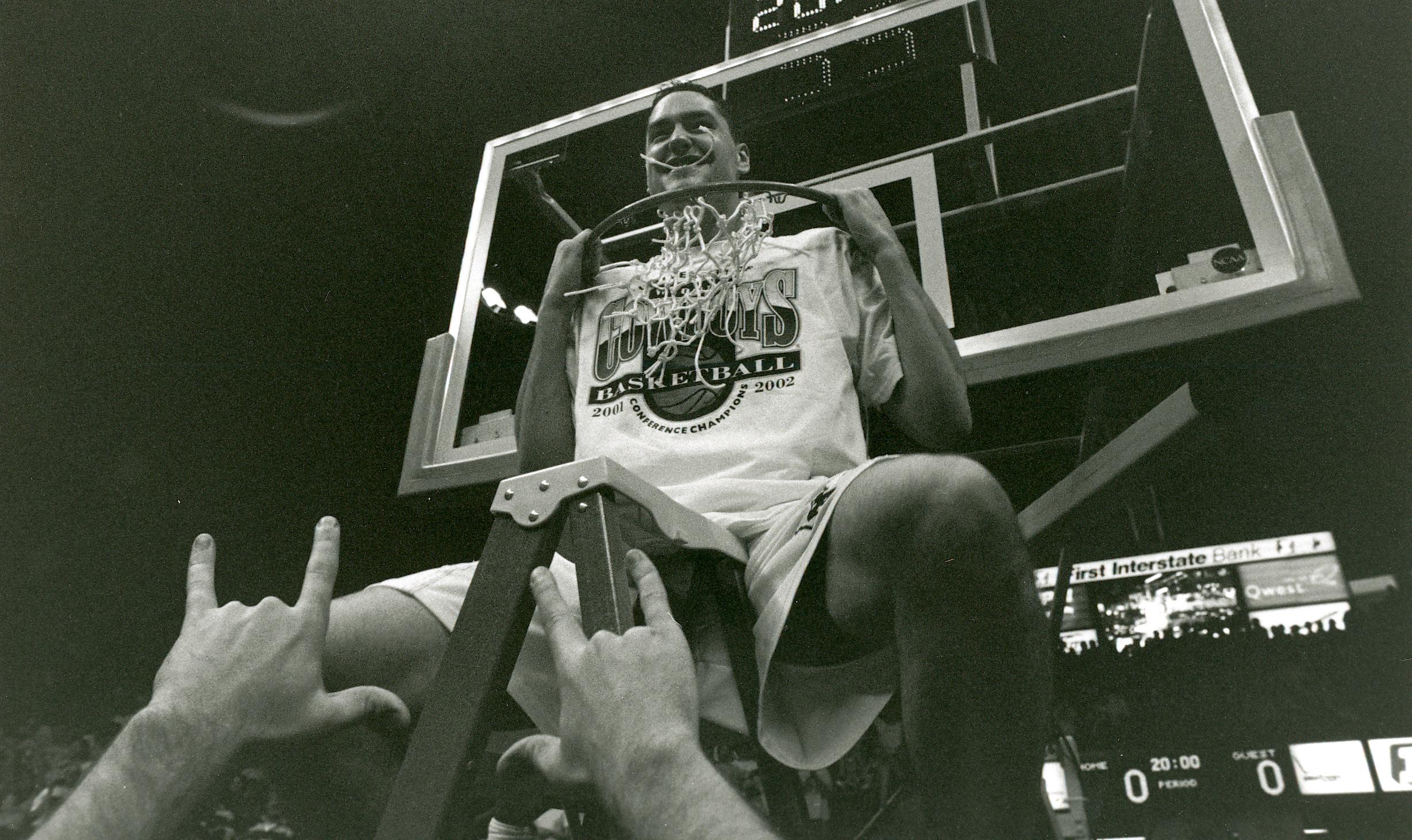 Marcus Bailey cuts down the net after the Cowboys won the 2002 MW Regular Season Championship.