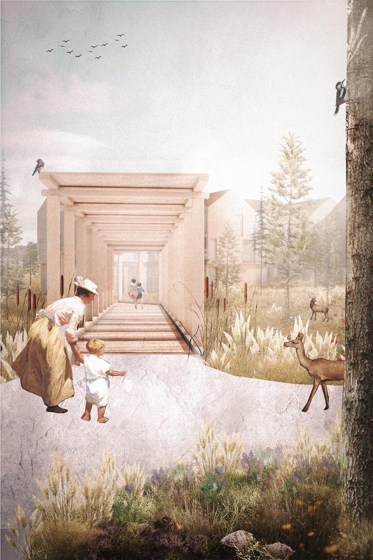 into a pedestrian connection zone, that connects the Play, Food, and Farming zones to one another.