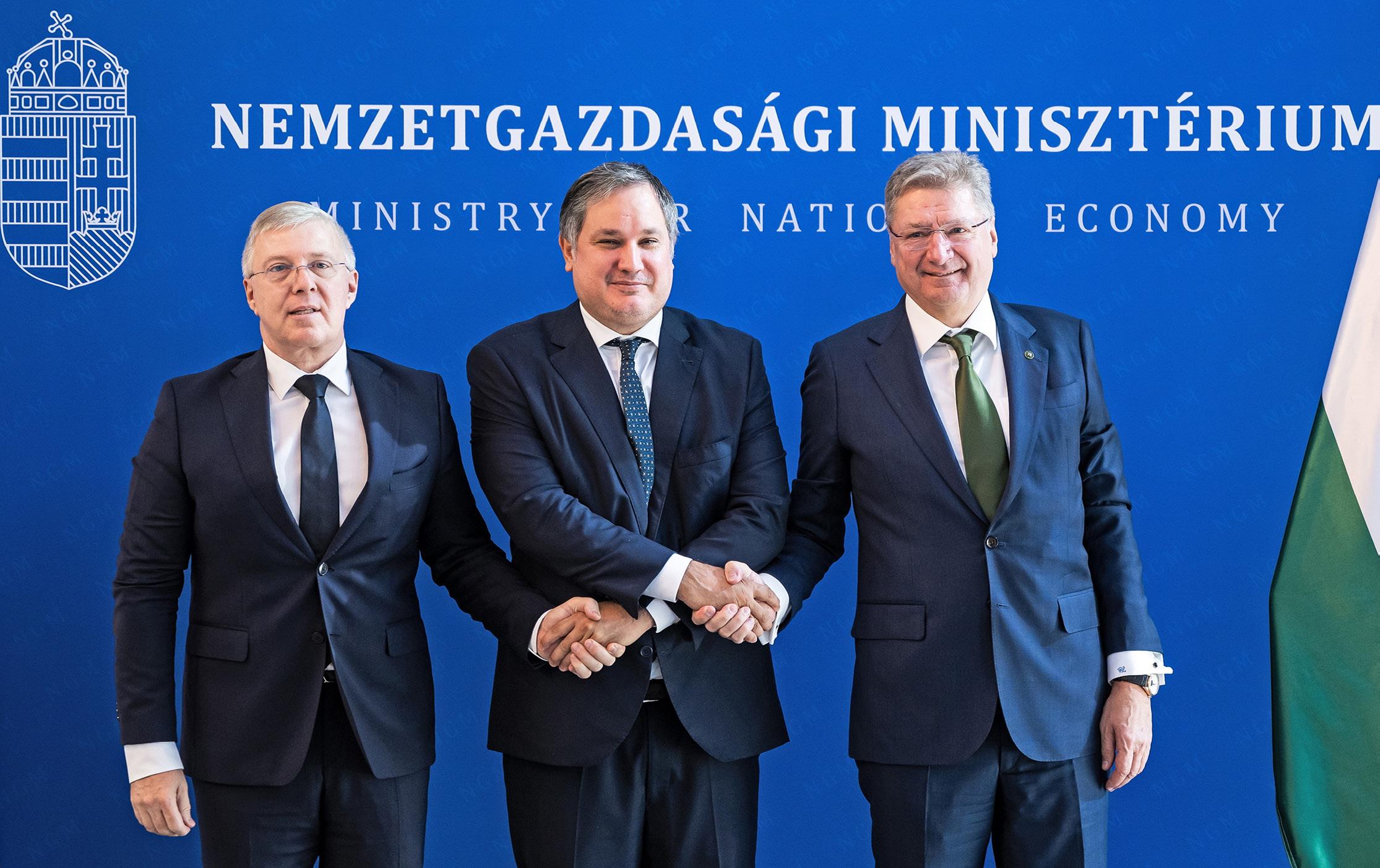 From left, László Krisán, CEO of Kavosz Zrt. (responsible for the professional management of the Széchenyi Card Program) and chairman of the board of trustees of the Kavosz Foundation, Minister of National Economy Márton Nagy, and László Parragh, president of the Hungarian Chamber of Commerce and Industry and chairman of the board of directors of Kavosz Zrt. after signing a cooperation agreement at the Ministry of Economy on Oct. 22.