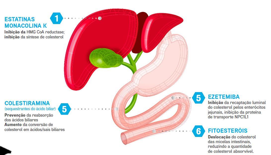 Atua nos 6 passos do metabolismo do colesterol (síntese, absorção, transformação e excreção)