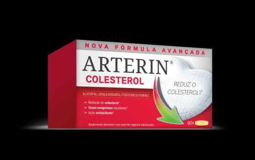 Arterin Colesterol é um SUPLEMENTO ALIMENTAR Os suplementos alimentares não substituem uma dieta variada nem um estilo de vida saudável Manter fora do alcance e da vista das crianças. O efeito benéfico é obtido com a toma de 1 2 comprimidos por dia de preferência à noite. Não exceder a toma diária recomendada. Não exceder a dose diária recomendada de 3 g por dia de esteróis vegetais adicionados (1 comprimido contém 120 mg de esteróis vegetais 2 comprimidos contêm 240 mg de esteróis vegetais). Consulte o seu médico ou farmacêutico se já estiver a tomar medicamentos antidislipidémicos. Não recomendado durante a gravidez ou amamentação. Apenas para adultos. Arterin® Colesterol deve fazer parte de uma dieta variada e equilibrada, incluindo o consumo regular de alimentos que contribuam para a manutenção dos níveis de carotenos. Não tomar em caso de alergia a qualquer um dos ingredientes. Para mais informações consultar a rotulagem e as instruções de utilização.