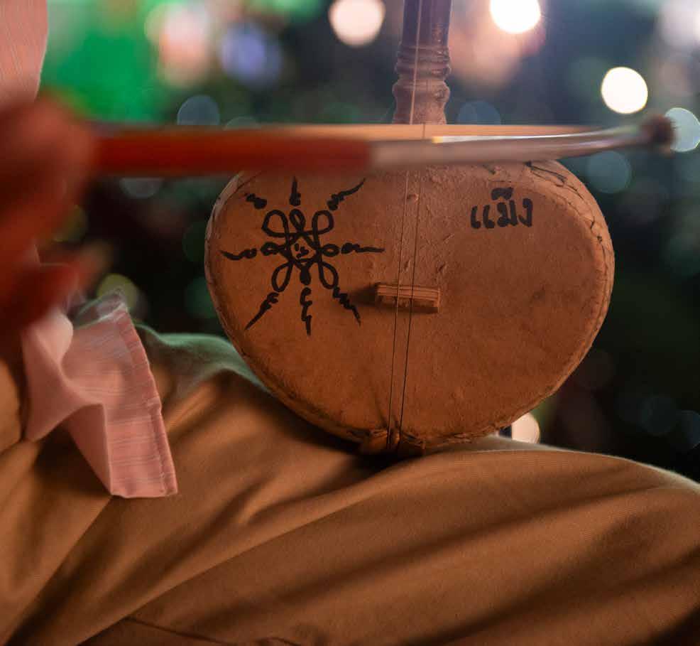 A musician playing the alto fiddle during a nang talung performance in Nakhon Si Thammarat, Thailand, 2003.
