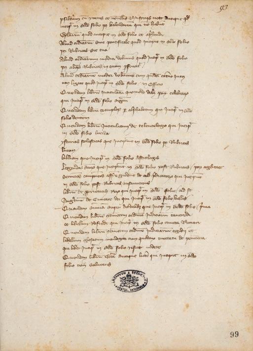 The library of Antonio degli Orsi’s successor, Francesco Silvestri da Cingoli, bishop of Florence from 1323 until 21 October 1341 (Salvestrini, Silvestri, Francesco), was much more substantial. The fate of his books is tied to another prelate, Tedice Aliotti, bishop of Fiesole, who died in 1335 and whose twenty-nine volumes, mostly legal in content, were confiscated by the apostolic commissioner Giovanni de Pererio in 1339 (Camera Apostolica, MS Collectoriae 244, fols. 8v–10v; Williman, Bibliothèques I, pp. 119–22 no. 335.5A; RICABIM 1, pp. 295–6, no. 1729). Three years later, in 1342, Aliotti’s manuscripts were filed in the monastery of Santa Maria in Florence along with those of the deceased bishop of Florence, Francesco Silvestri, and a shared inventory was drawn up for the two collections (MS Collectoriae 244, fols. 97r–100r; Williman, Bibliothèques I, pp. 122–5 no. 335.5B). A total of seventy-six books are listed here, including the two bishops’ volumes. In both documents (those written in 1339 and 1342), the compiler decided to indicate not only the contents and external characteristics, but also the start of the second leaf and the end of the penultimate one, providing a crucial means of identifying the individual objects. The second of these inventories includes, at number 38, the following item: “Quendam librum intitulatum De teuletelogio, qui inc. in 2° folio || lucida”. This is MS Marc. Lat. VI 167 (3489), an exquisite copy of Ubaldus di Sebastiano of Gubbio’s work Teleutelogio, which includes a letter of dedication to Francesco Silvestri himself (entry 4). The bishop of Florence’s books placed in the Badia Fiorentina monastery by commissioner Giovanni de Pereiro had been listed in a separate inven-