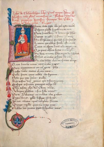Teleutelogio, meanwhile, was not very successful, with only two surviving manuscripts to document it: MSS Marciano and the 15th-century Laur. 13.16 (fols. 180r–220v). A faint trace of the reach of the dialogue is contained within an unusual and practically unknown work by the Pisan writer Niccolò di Lapo Lanfreducci entitled Disputatio, a lengthy complaint about his unfaithful wife, and about all women in general, composed at the very end of the 14th century (Petoletti, Una storia nascosta). In MS Marciano, transcribed by the renowned ‘Scribe of Parm’ (entry 27), Ubaldus’s hand has also been recognized circumstantially in certain interlinear interventions to correct errors made by the scribe, and above all in a sort of letter of dedication on fol. IIv, written in a different hand from the main scribe and addressed to Francesco Silvestri da Cingoli, bishop of Florence between 1323 and 1341 (Rossi, Da Dante a Leonardo, pp. 283–6; Bertin, Nuovi argomenti; Idem, Ubaldo). The miniature at the beginning, on fol. 1r, depicts a pope, probably Pope John XXII, who is praised in the initial poem, but it could also, to some extent, have referred to Francesco da Cingoli, hailed by Ubaldus in the short letter on fol. IIv as a second pope, “both for the dignity of his episcopal office and the generosity of his heart”, and explicitly held up as the meta and terminus of the author’s literary effort. Here Ubaldus explains the title’s meaning: “Est enim grece theleuthon, latine mors, logos sermo, quasi liber de sermone mortis, in quo multa maiorum dicta tam poetica quam philosofica, istoriagrapha atque iuridica aridus ager mei animi conglobavit” (“Thus in Greek theleuthon means “death” in Latin, and logos means “speech”, in other words a “Book that talks about death”, in which the arid field of my soul has gathered many words from the ancients, drawing them both from poetry and from philosophy, history and law”). The author then encourages the bishop to read at least the fi-