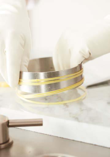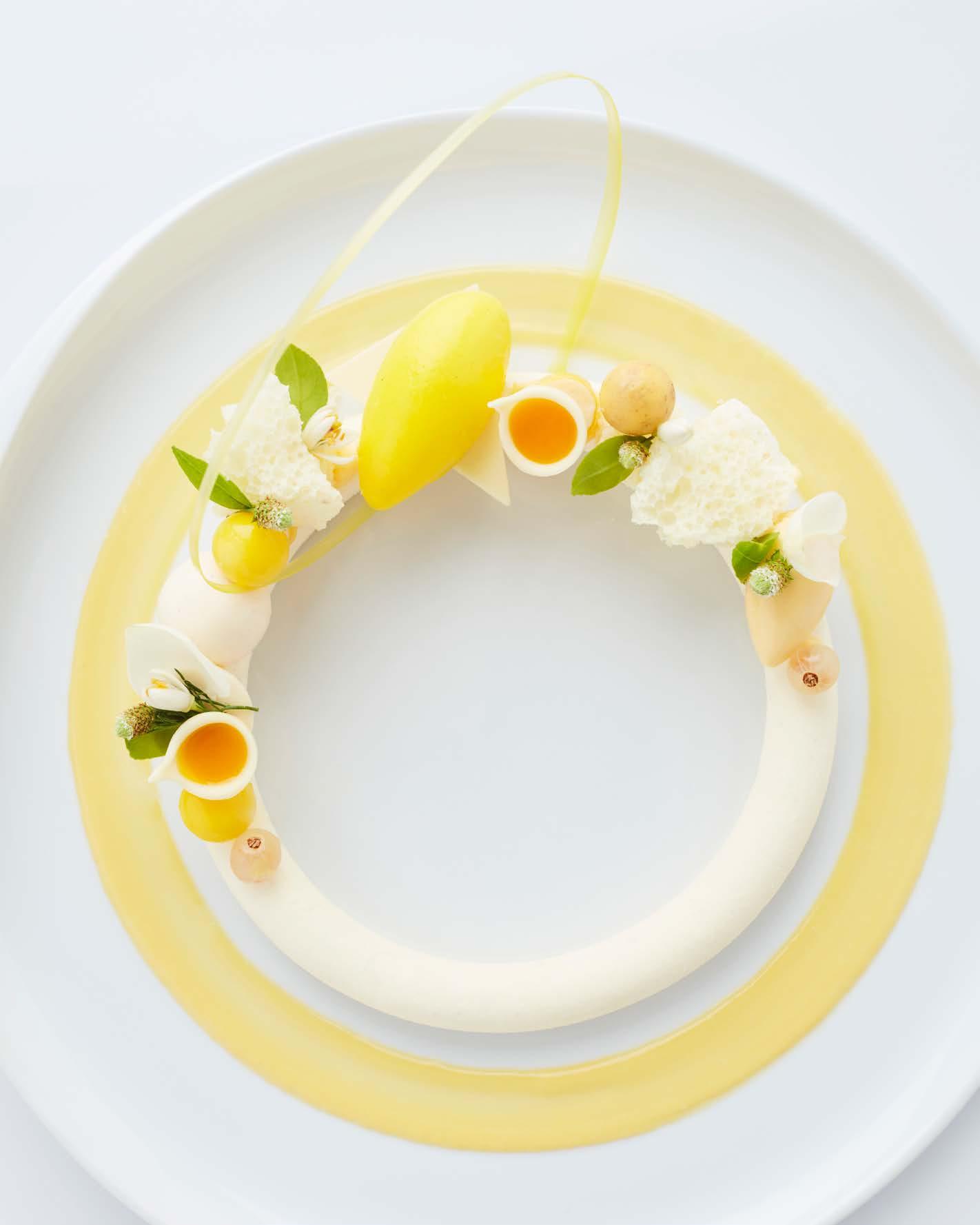 Fill a piping bag with the panna cotta and fill the silicone mold. Pipe a thin layer of mango vinegar gelée into the panna cotta using a piping bag and level off. Allow the panna cotta to set overnight in the freezer. Place the frozen ring on a plate and serve once the panna cotta has defrosted.