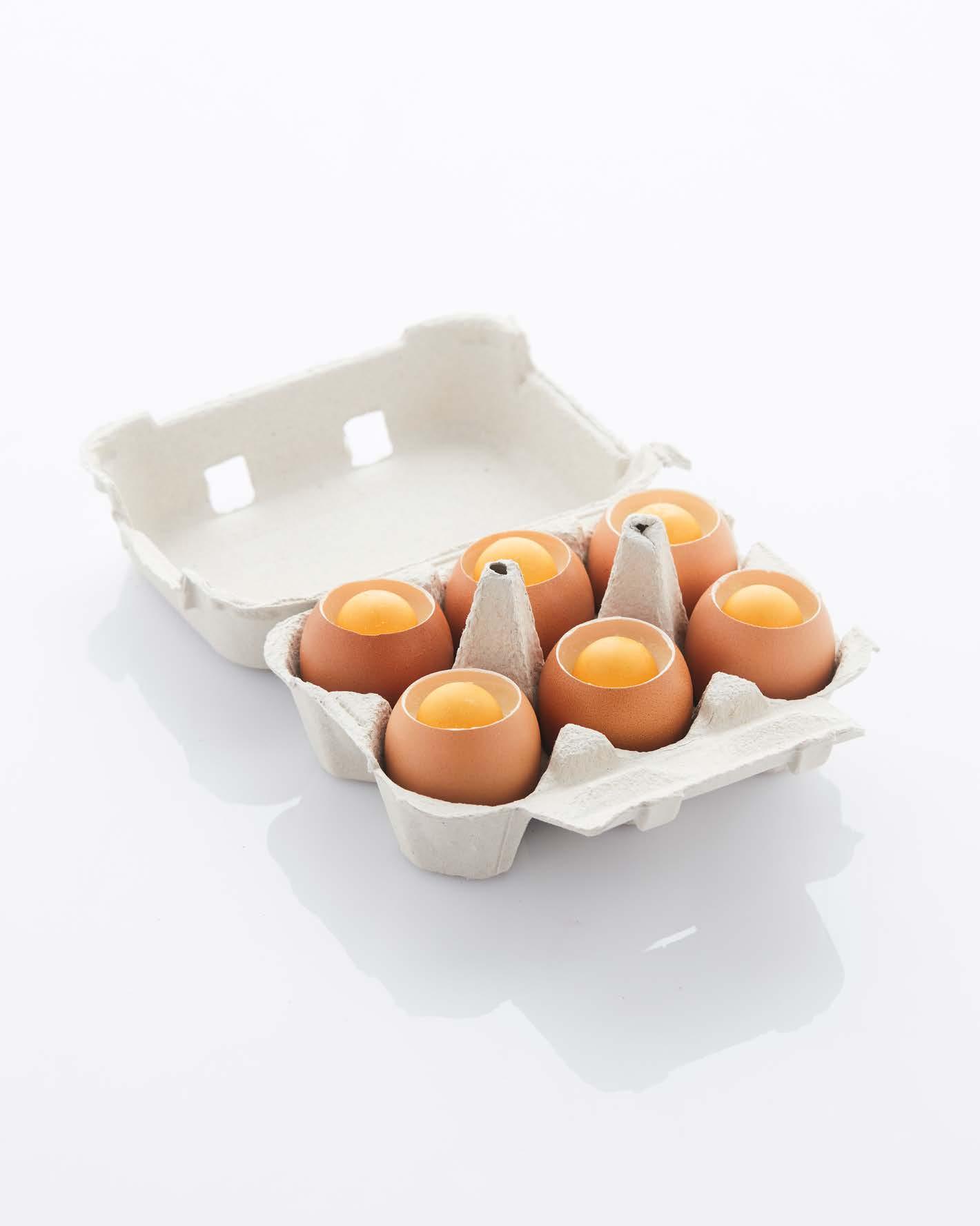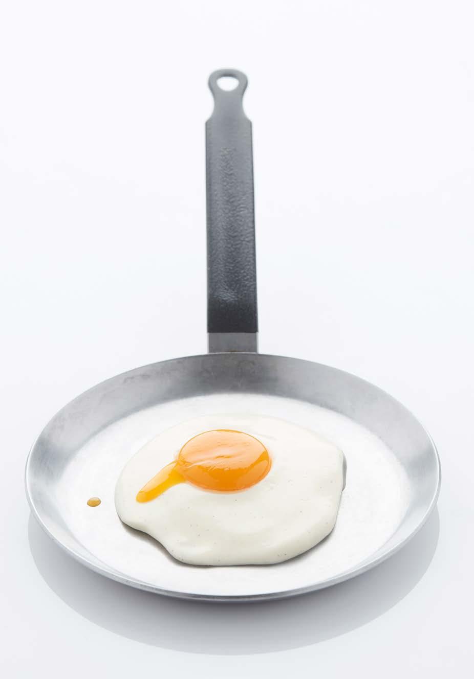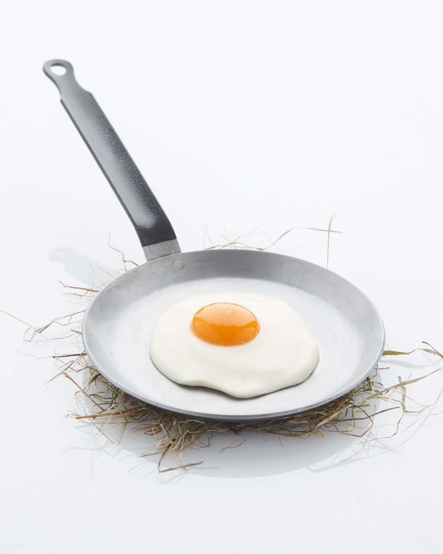 Use a piping bag to pipe the panna cotta into the silicone mold (shaped like a fried egg) and chill in the freezer. Unmold the panna cotta, place the still frozen ‘egg white’ on a plate and allow to defrost.
