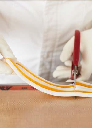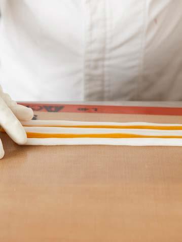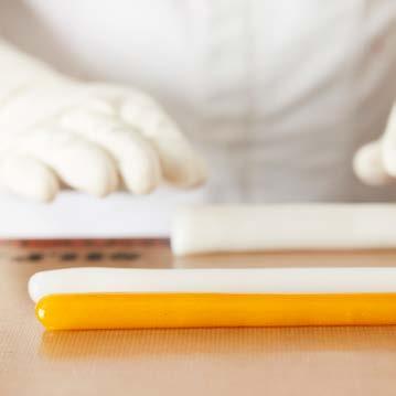 Fold the mixture into the whipped cream and pipe into the silicone quenelle molds using a piping bag. Freeze, remove from the mold, place on a wire rack and pour the yellow glaze over the quenelle. Defrost in the refrigerator before use.