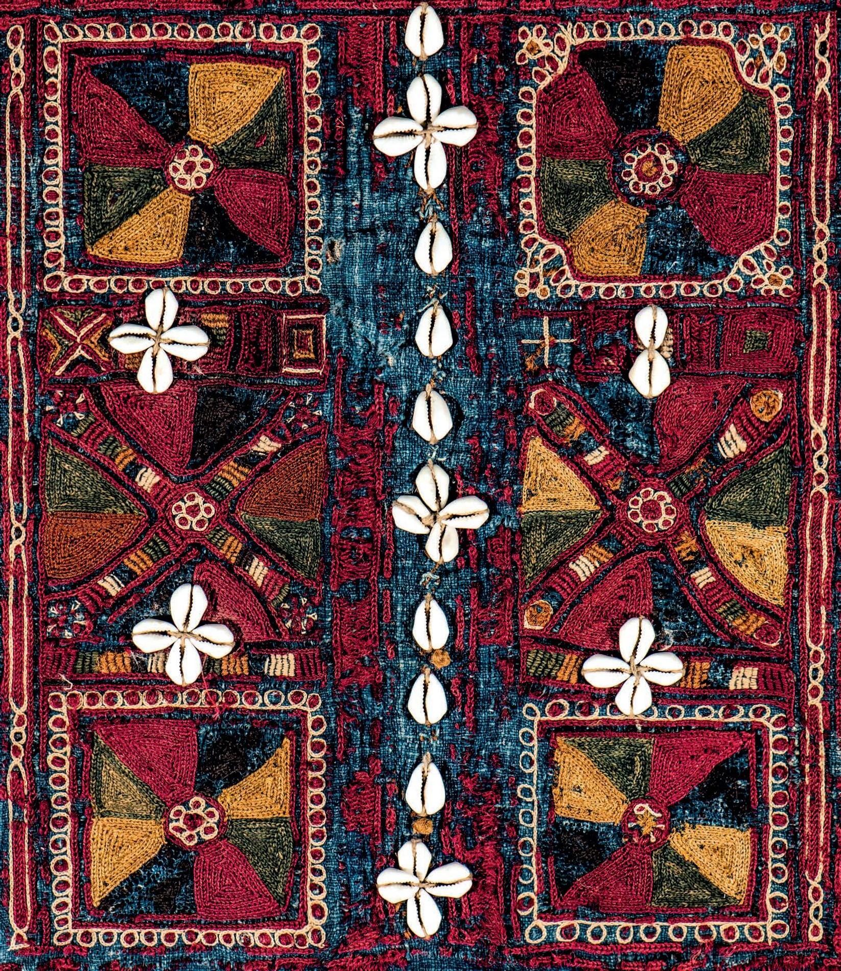 Cotton plain-weave ground with embroidery in cotton and wool thread in chain-stitch, raised satin stitch and herringbone stitch, applied cowrie shells