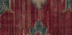 The end (pallu) of this waist sash displays four Mughal-style owering plants against a gold ground while the lac-red central eld is lled with o set rows of golden double cloud-band motifs. The narrow side and cross borders all display a "rosette, leaf and stem" meander. Silk and metal-thread patkas woven in Ahmedabad are considered to be among the world’s most beautiful and technically sophisticated examples of draw-loom weaving. In the Mughal period, both fashion and strict protocol demanded that attendance at court required the wearing of one’s nest patka, whether loom-woven or made of block-printed, hand-painted or embroidered cotton, silk or pashmina (cat.71 and 97). But patkas like this one, woven with richly dyed silk and precious metal-wrapped thread, were the most costly and conferred the highest status.