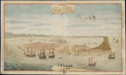 sive Zeelandia fortress (5) occupies a central position on the map. It is defended by imposing bastions (7), together with the fleet of fluyt (literally ‘flute’), the ships specifically designed and built by the Dutch for transoceanic voyages. As well as being able to carry a considerable amount of cargo, they were also fitted with fifteen guns and were easy to build and maintain. In addition to the fluyt, there are also numerous smaller vessels in the harbour, which were used for local trade. Towards the bottom of the map we can glimpse a Dutch captain meeting a Chinese official (10). The bird’s eye view of Taÿoan forms a cartographic diptych with the nautical chart of Formosa (CdC 14).