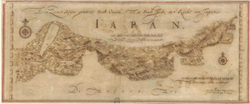 Carte di Castello 4 and 5 form a cartographic diptych of Japan, painting a highly detailed picture of the coastlines of the islands of Kyu¯shu¯ and Honshu¯ and showing the land and sea routes from Nagasaki to Edo (present-day Tokyo) passing through Osaka and Kyoto. The route illustrates the main stops on the jour-