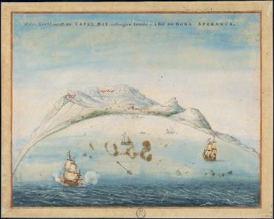 The extraordinary marine view of Table Bay, north-west of the Cape of Good Hope, observed from an elevated position out at sea, a few miles offshore, creates the pictorial illusion of an aerial image within which the beauty and airiness of the elements unfurl. The sea, the breeze highlighted by the crests of the waves, the ships driven by the wind and the mountains of the Cape that stand out against the clear blue sky, give the viewer a feel for the sensory experience of sailing. At the same time, Vingboons’s miniaturistic style accurately defines the profile of the mountains and the location of the fort, which are important details for those approaching the bay by sea.