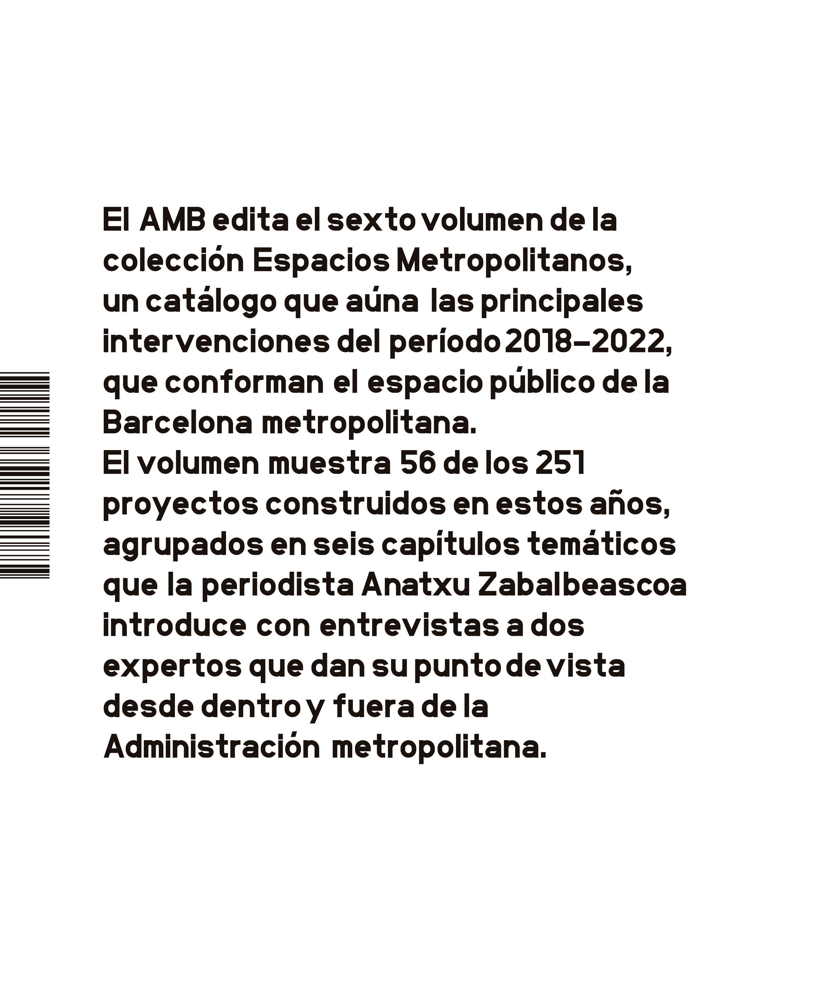 Nos complace presentarles espacio público en la barcelona metropolitana. intervenciones y diálogos 2018-2022, el sexto libro de la colección que edita regularmente el Área Metropolitana de Barcelona (AMB) y que recoge una selección de proyectos de espacio público realizados en el área metropolitana en estos cinco años. Son obras construidas para que la ciudad evolucione a través de nuevas miradas, pero que mantienen los principios que nos han traído hasta aquí.