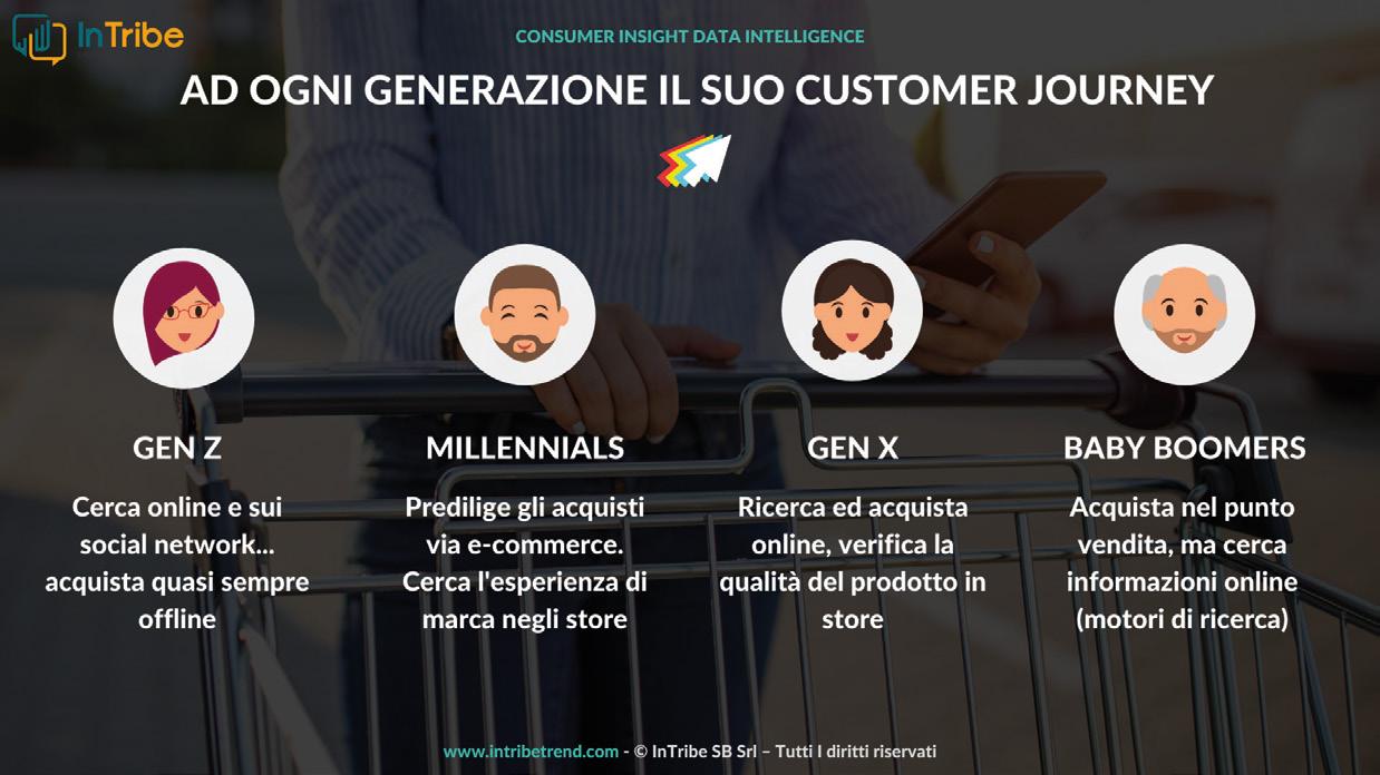 smartphone o un tablet per comunicare con i parenti, gli amici e i colleghi. Per forze di causa maggiore le nostre vite hanno vissuto in simbiosi con questi device per mesi. Oggi stiamo vivendo una nuova normalità che, da una parte ci spinge ad allontanarci da questi strumenti e a vivere la vita reale, ma che dall’altra ci ha fatto fare un salto nel mondo digitale da cui siamo sempre più dipenden ti: spesa e acquisti online, piattaforme di streaming, videochiamate, il Metaverso Volenti o meno, i brand devono adattarsi al digitale e a quello che si aspettano i consumatori delle diverse generazioni con le rispettive competenze digitali. I consu matori sono passati dal cercare e credere in brand affermati - Baby Boomers - a brand esperienzali - Millennials - per ar rivare alla ricerca di brand coinvolgentiGenerazione Alfa -. Le nuove generazioni non si preoccupano più della notorietà di