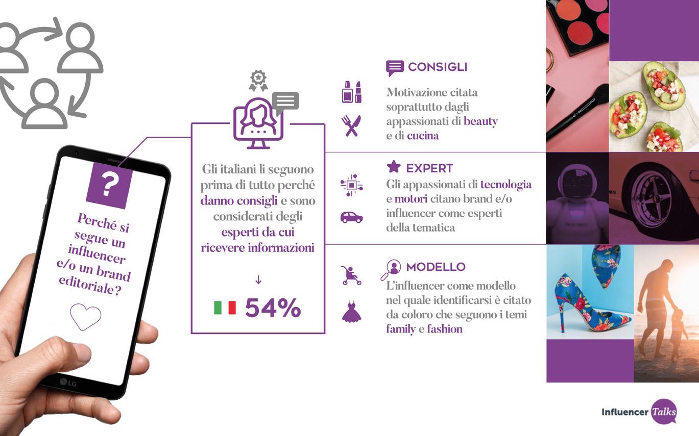 Perché si segue un influencer? Il 54% dichiara la propria preferenza per i consigli che può dare, il 51% segue gli influencer perché sono esperti in determinati argomenti. Infine, un 19% degli intervistati afferma che la motivazione principale risiede nella ricerca di un modello di riferimento con il quale identificarsi