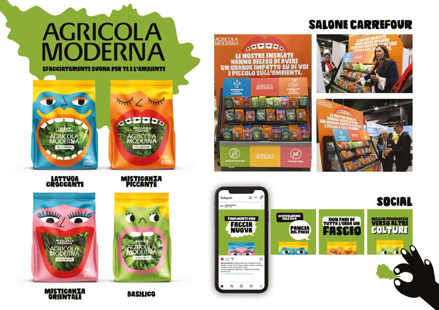 Trasformare l’insalata in un alimento appetitoso e goloso come caramelle o patatine, invece che presentarla come il solito contorno triste e un cibo da rinuncia al gusto? Ci ha pensato Gitto/Battaglia_22 per Agricola Moderna, un brand che integra tradizione, innovazione tecnologica e sostenibilità. Il primo impianto di vertical farming in Italia, grazie a uno impianto di 1000m2 su otto piani, a Melzo, in provincia di Milano, coltiva oltre 2.000kg al mese di insalate e basilico grazie a un metodo produttivo che permette la coltivazione senza l’uso di pesticidi e fitofarmaci, risparmiando il 95% di acqua, il 98% di suolo e aumentando del 100% la produttività a metro quadrato. L’azienda che fornisce insalate a Cortilia e alla rete di supermercati Carrefour in Lombardia è convinta dell’importanza di una comunicazione capace di raccontare una filosofia produttiva e un concept di innovazione e ricerca. Per raggiungere tale obiet tivo, Gitto/Battaglia_22 ha presentato una strategia di comunicazione forte e visionaria, in sintonia con la mission aziendale: dare la possibilità al consumatore finale di portare in tavola prodotti sani, perché senza pesticidi, gustosi e da agricoltura sostenibile.