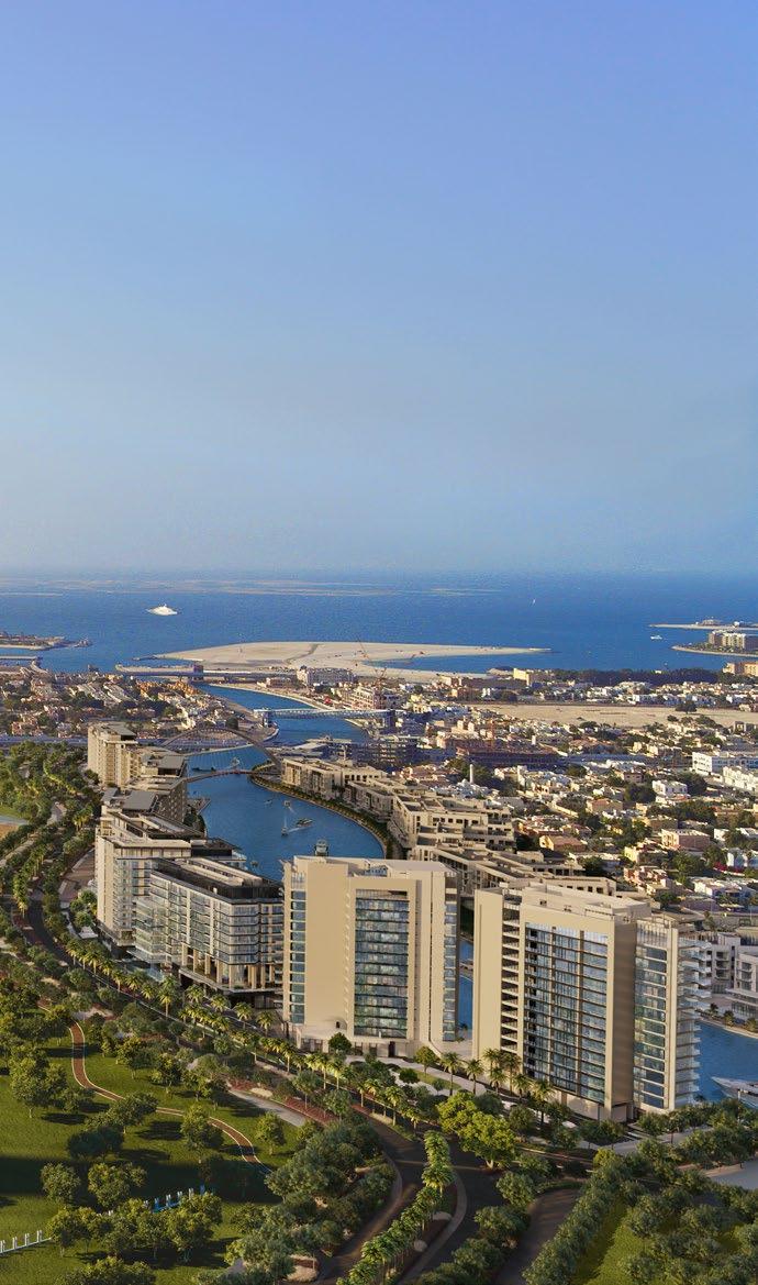 Contemplative gardens and sports and recreational areas invite a healthy lifestyle, surrounded by a pristine body of water, which is the essence of the development. Modern amenities and active areas contrast with private and quiet neighborhoods in a delicate balance, creating a unique community in a privileged central location within Dubai.
