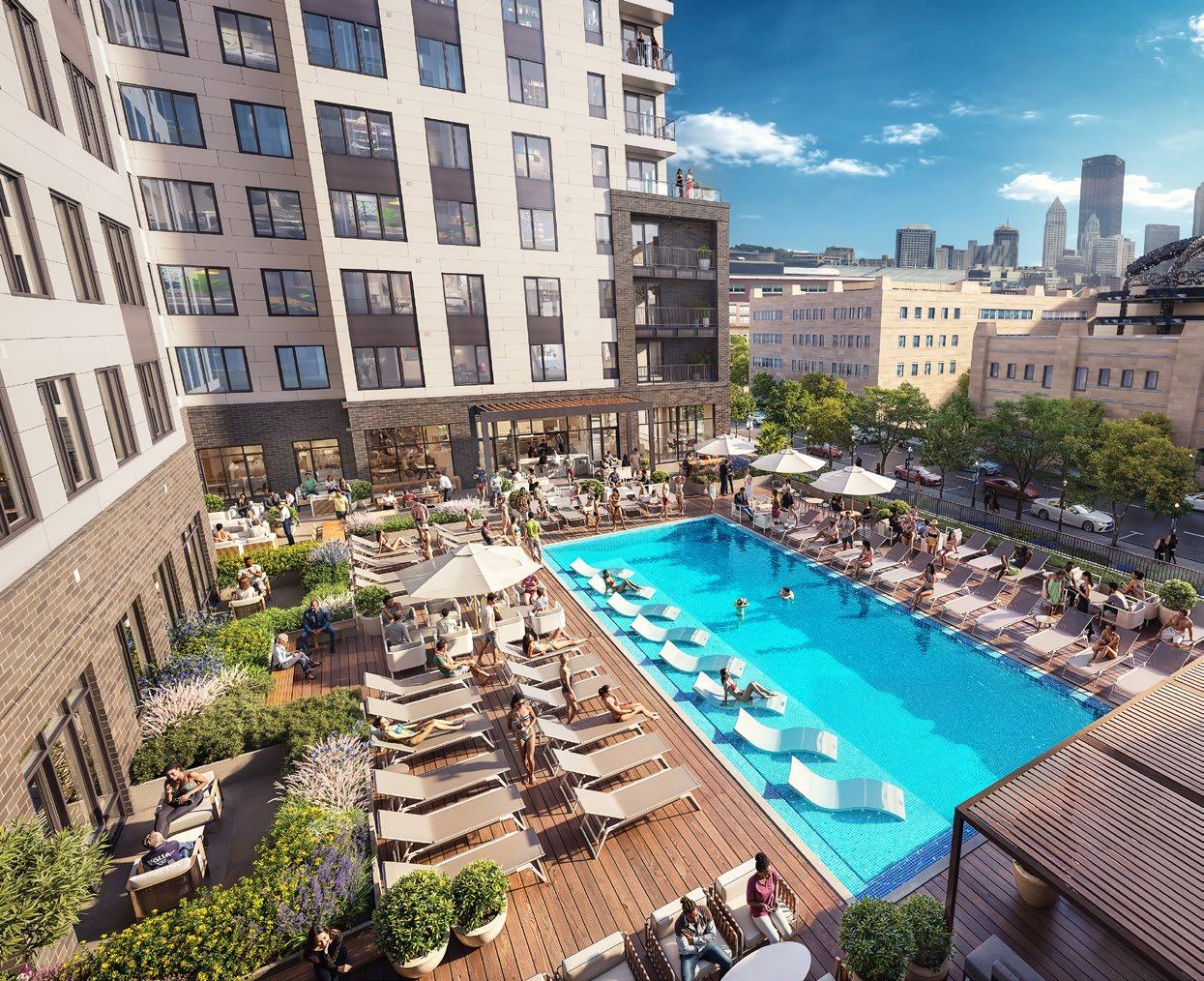The West General Robinson Apartments is a multifamily lifestyle destination for sports enthusiasts and those who enjoy living in the bustle of the lively city neighborhood. Located across from one of the most beautiful baseball stadiums in the US, PNC Park, the complex immerses the residents in the experience that Pittsburgh’s North Shore has to offer. The development is closely connected to the sports culture, local restaurants, and beautifully developed riverfront. The signature rooftop pool and amenity terrace overlook PNC Park (MBL), Acrisure Stadium (NFL), and the Pittsburgh city skyline. The mix consists of a variety of luxury apartments with 8 penthouse residences offering generous and thoughtful floor plans, the latest technologies, and lots of natural light. The materials respond to the masonry and warehouse aesthetic of the North Shore and create a dialog with the materiality of the neighboring ballpark.