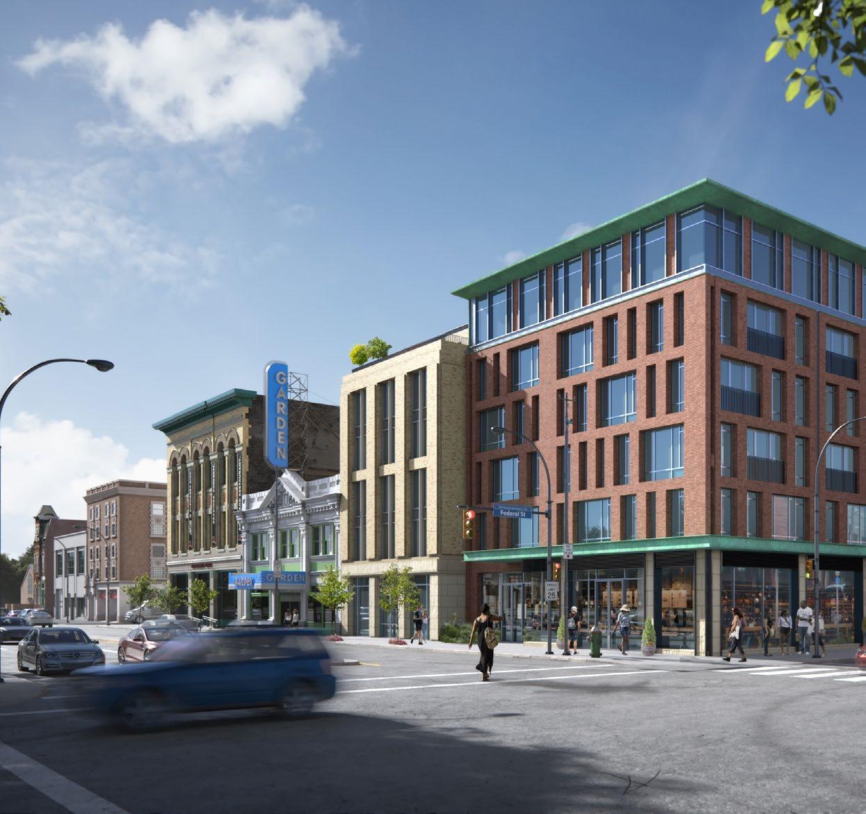 After studying the needs of Pittsburgh’s North Side, our team designed a plan to restore a local landmark, the abandoned Garden Theater, by reimagining it as multifamily housing units, which reflect the historic character of its surroundings. To authentically blend in with its immediate neighbors, our plan segmented the building into three facades, each of which reflects the materials, scale, and colors of the area while providing a bit of contemporary flavor. The appearance of columns and double height windows creates a bespoke look, while brick and copper bring timelessness and richness to the construction materials, giving a nod to the future without being overly contemporary. The upper floors are mixed-income residences with an affordable component, while the ground floor is reserved for retail aimed to serve the nextdoor hospital and the nearby tourist attractions. To keep the original building’s legacy entact, the Garden Theater’s marquee is one of several original signs to be rehabbed and returned to the building—its fully-lit flare marking the entrance for a proudly restored neighborhood icon. Our concept renews a building with deep historic roots in the community, simultaneously respecting the past and keeping an eye on the need to adapt for the future.