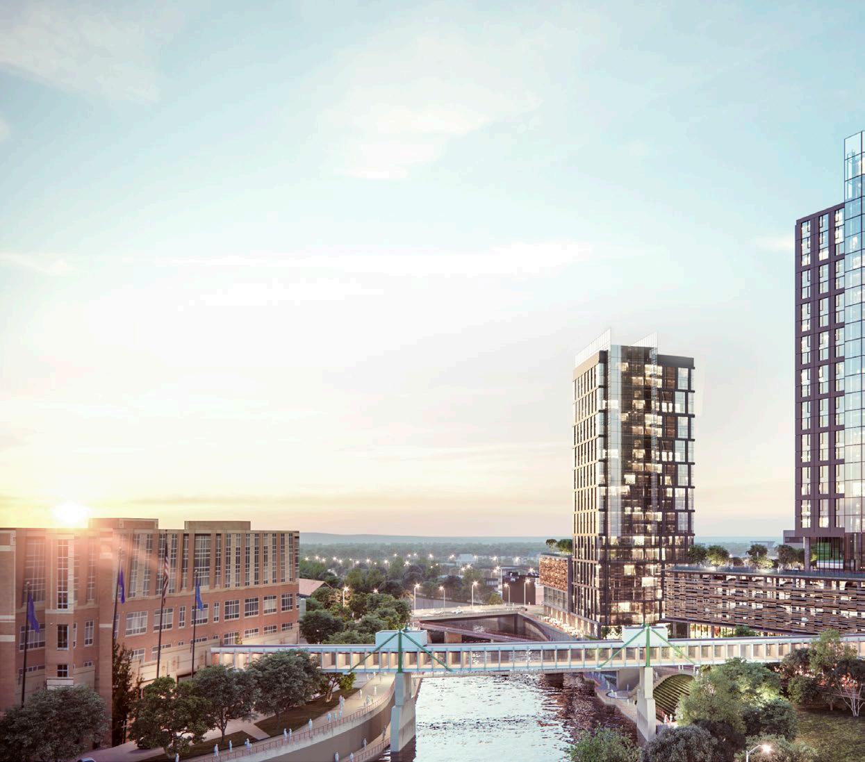 The Bloom Development in Rochester, MN, is located on the riverfront of the Zumbro River and aspires to set a new standard of quality in the downtown business district. This 1,000,000-square-foot development creates an inclusive destination of hospitality and shopping, complemented with contemporary restaurants and nightlife. The project is composed of two high-rise towers that house a four-star hotel, condominiums, and senior living apartments. The towers are atop a podium that features ground level retail, restaurants and a parking garage. The masterplan concept improves access to the Zumbro Riverfront with a boardwalk, creating a pedestrian-friendly environment and enlivening the river’s edge. The location is ideal to form an urban hub connecting City Hall to the opposite side of the river and the commercial downtown area.