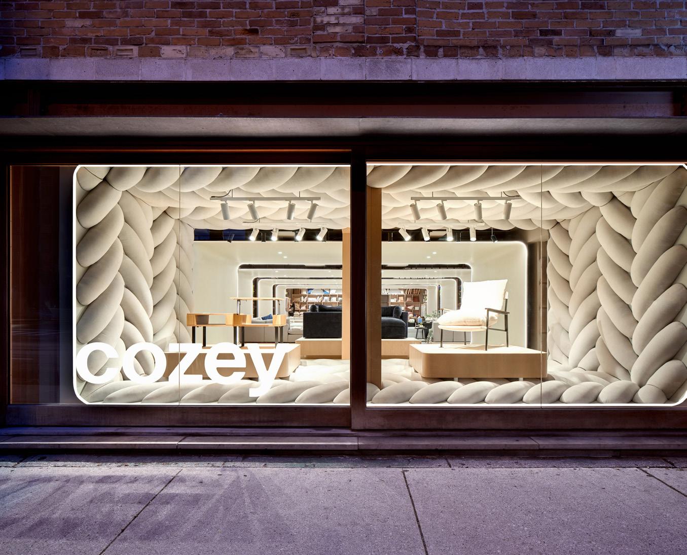 Un tout premier terrain d’expérimentation à grande échelle fut la boutique-phare Cozey à Toronto, conçue avec LAAB et Cossette. Studio Officiel fabrique la vitrine comme une onde textile monumentale, suspendue entre virtuel et réel. On comprend ici ce qui anime le duo : une scénographie du quotidien qui dépasse la fonction commerciale pour explorer la théâtralité, la fluidité et la sensation.