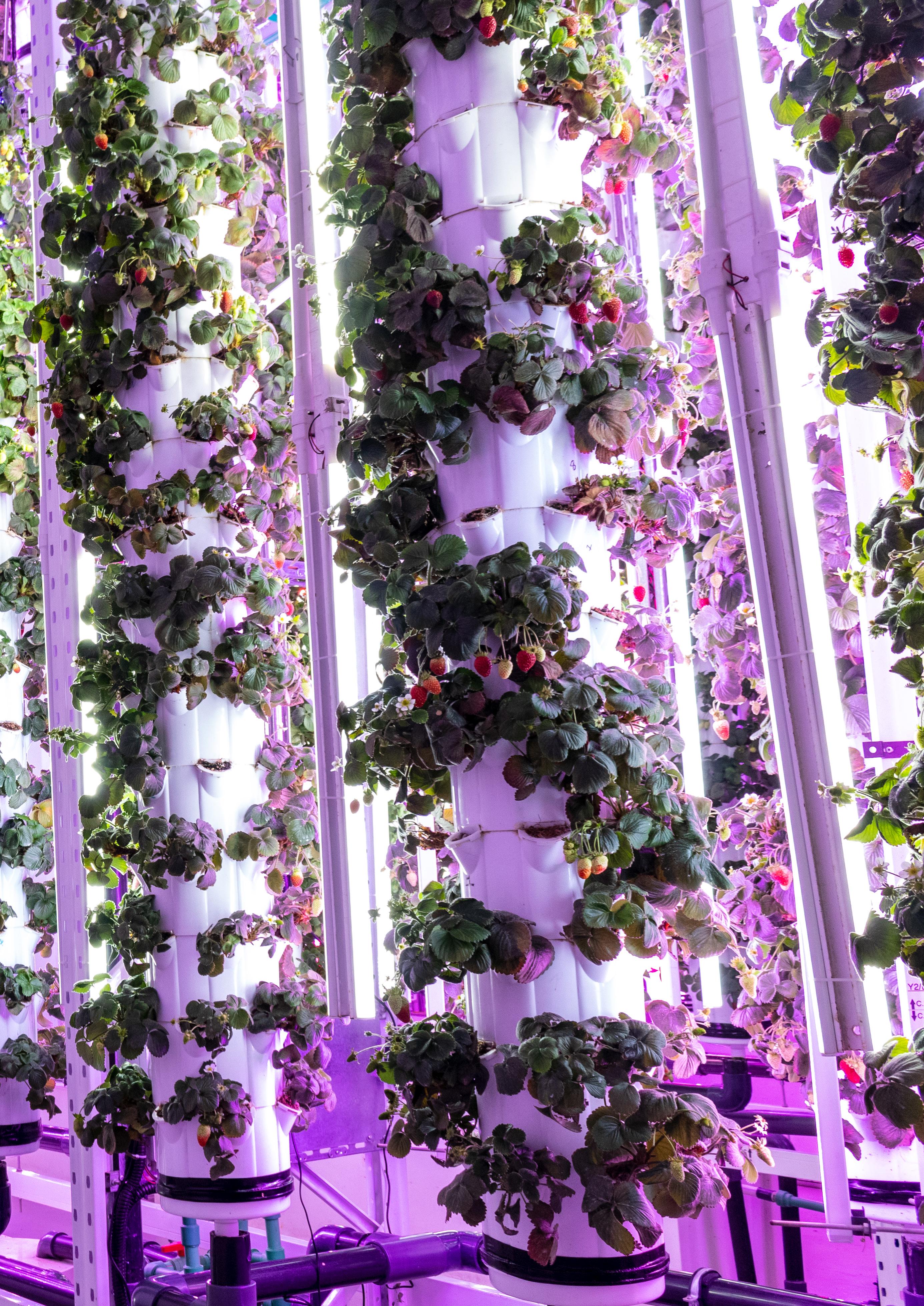 51 Zoals zichtbaar op bovenstaande foto worden hier aardbeien geteeld in een roterend torensysteem.