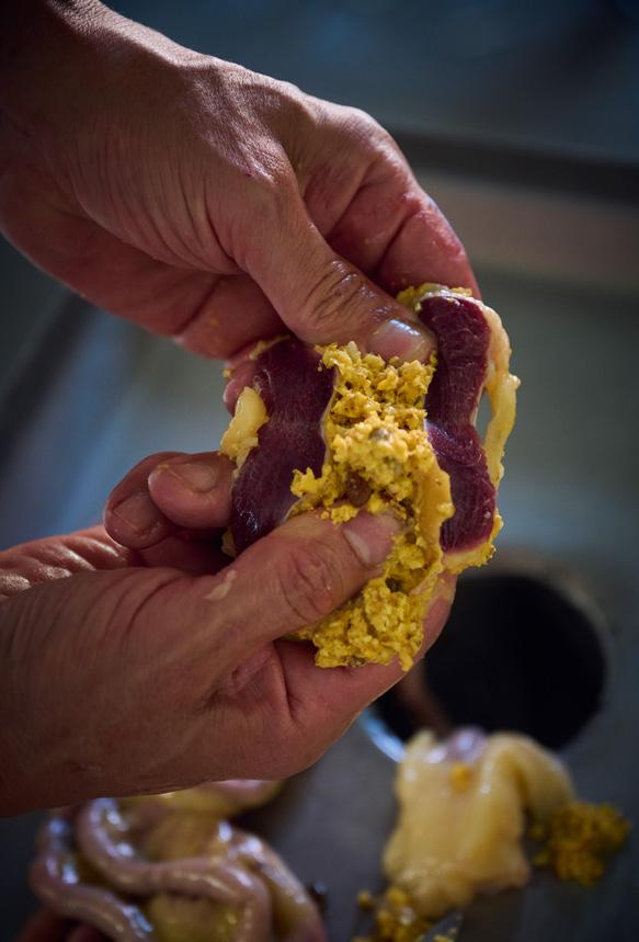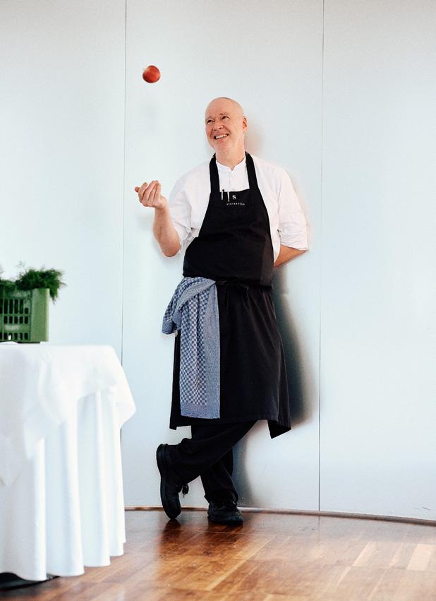 schalten und walten kann, wie er will. Zumindest in der Küche und im am Abend so stimmungsvoll ausgeleuchteten Restaurant. Und allein diese Küche ist ein Kunstwerk für sich, speziell die Bühne direkt davor. „Wir haben die Zeit der Lockdowns sinnvoll genützt und Küche und Restaurant komplett umgebaut“, erzählt der Chef. So verbirgt sich heute hinter einer riesigen Schiebetür mit einer in Lebensgröße abgebildeten Küchenszene aus vergangenen Zeiten das Reich von Philip und seinem Team und sobald es losgeht mit dem Verwöhnen