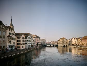 Das Wasser prägt das Leben in Zürich. See und Fluss, links die Münsterbrücke über die Limmat, nehmen die Stadt liebevoll in die Arme. Hier mischen sich Eleganz, Spaß, Trubel und Melancholie.