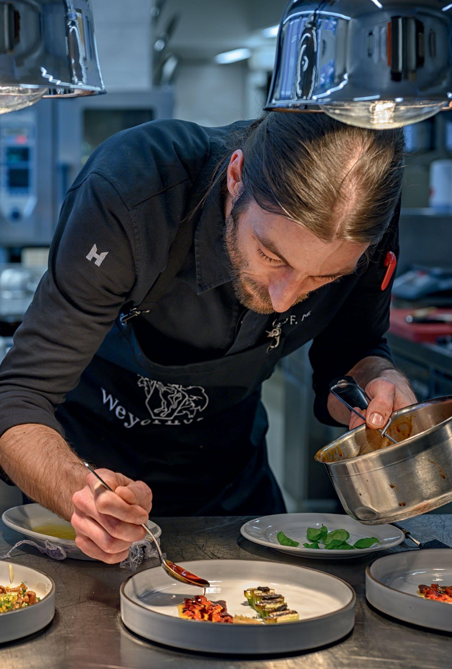 Franz Meilinger, ein 1983er-Jahrgang, ist der eine, Andreas Stotter, geboren 1987, der andere. Der Franz ist quasi der Weyerhof-Hausherr, befindet sich dieses einmalig schöne Gemäuer immerhin schon seit über 200 Jahren in Familienbesitz. Und das Wirtshauskind wollte eines schon immer werden, nämlich Koch. „Der Ritterschlag, wenn man so will, war, als ich als Bub erstmals nicht nur niedere Dienste wie Schnittlauch schneiden, Zwiebeln schälen oder Umrühren versah, sondern erstmals allein Kasnocken zubereiten durfte“, erinnert sich der zweifache Jungvater. Ella ist zwei, Luisa eins. Später dann besuchte er die Hotelfachschule in Bad Hofgastein, und nachdem er diese abgeschlossen hatte, zog es ihn in die große Stadt. „Das war im Oktober 2003, und ich habe auf Anhieb einen Job im alten Steirereck in der Rasumofskygasse gefunden.“