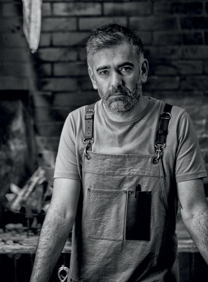 Die gibt es auch im FOGO, zu Deutsch Feuer, das Chef Alexandre Silva 2019 eröffnet hat. Der dunkel-schummrige Raum wird von den Holzstößen (verschiedene Sorten, für verschiedene Gerichte!) an der Wand, von den aus hauchdünnem, lichtdurchlässig orangem Marmor gefertigten Leuchten, die sich wie Flammen entlang der Decke durchs Lokal züngeln – und, natürlich, von der großen, offenen Küche bestimmt, in der eine massive Glutgrube und ein Holzofen die alles bestimmenden Elemente sind. Irgendwo weit über den Flammen liegt ein Spanferkel auf einem Gitter – „das soll ein wenig Rauch abbekommen, bevor wir es für den Abendservice in den Ofen schieben“ –, während die vielköpfige Küchenmannschaft sich dem Mittagsgeschäft widmet. Es gibt grandios cremige Polenta mit Herzmuscheln, zart rauchige Vongole mit Knoblauch und Koriander aus dem Ofen und fantastische Messermuscheln vom Grill – die Qualität der portugiesischen Meeresfrüchte ist in Europa immer noch unerreicht. Es gibt aber auch den Kopf eines riesenhaften Glattbutts, knusprig gegrillt und mit „Molho à Espanhola“, einer Salsa aus Paprika, Petersilie, Zitrone und süßem Gemüsezwiebel versehen, ein außerordentlich saftiges, fleischiges Vergnügen der vor Meeresfrische vibrierenden Sorte. Nacken vom Blauflossenthun wird am Knochen zu unanständig geilem Schmelz gegrillt, das Lamm mit im Ofen geschmortem (und wild angeknuspertem) Reis im gusseisernen Topf will man aber auch. Für Alexandre Silva ist das Fogo bereits das zweite Restaurant – in seinem anderen, dem radikal regional ausgerichteten Loco, hat er bereits einen Stern.