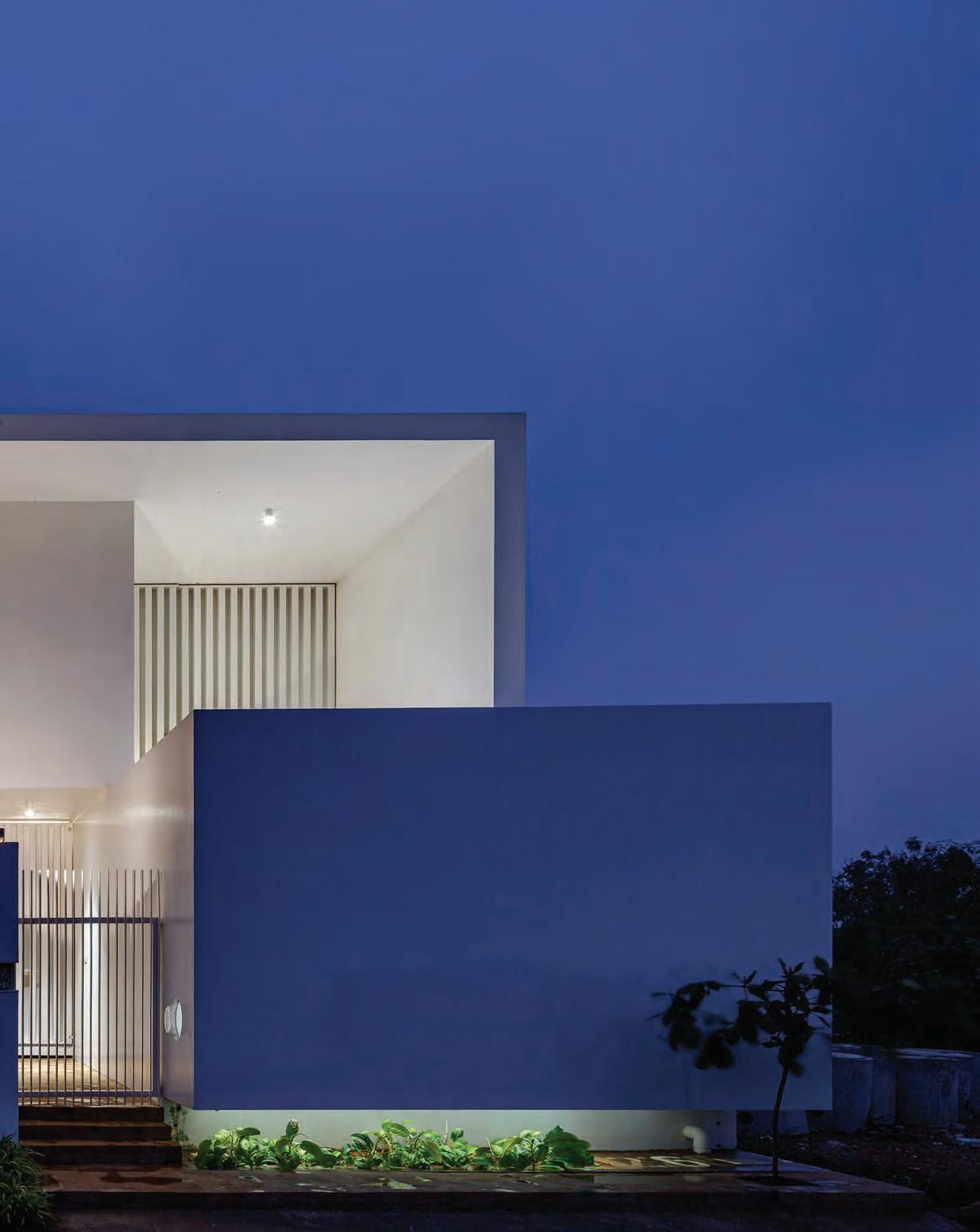 In the shuttle-wise white boxes with customized steel fins on the exterior, an arithmetic representation of the house number is inscribed on a stainless-steel rotating cube, and Also The House no.26 has been cut out on the front floating slab to create a beautiful night view projection, Creating a minimal, Unconventional and Captivating Elevation.