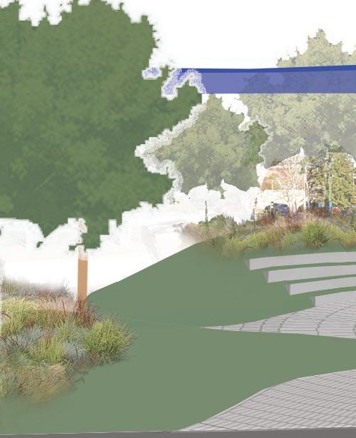 VEGETATED MOUND VEGETATED MOUND VEGETATED MOUND VEGETATED MOUND PERGOLA RADIAL PAVING PATTERN SHADED SEATING INTEGRATED SEATWALL INTEGRATED SEATWALL RESTORE