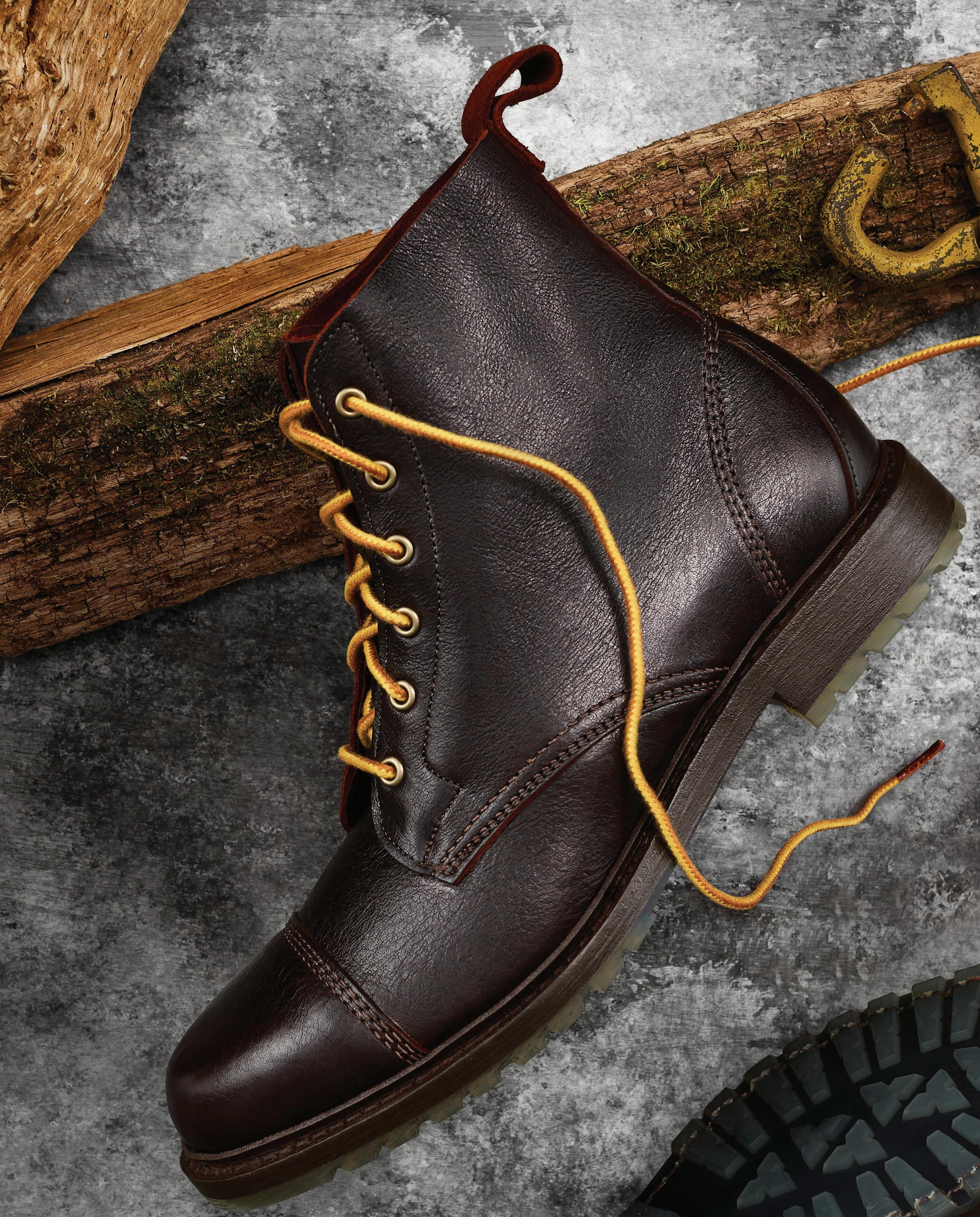 A vintage World War II militarystyle boot provides a polished and distinguished look. This handsome boot is crafted with distressed, supple Kudu leather and finished with a smoky translucent lug sole.