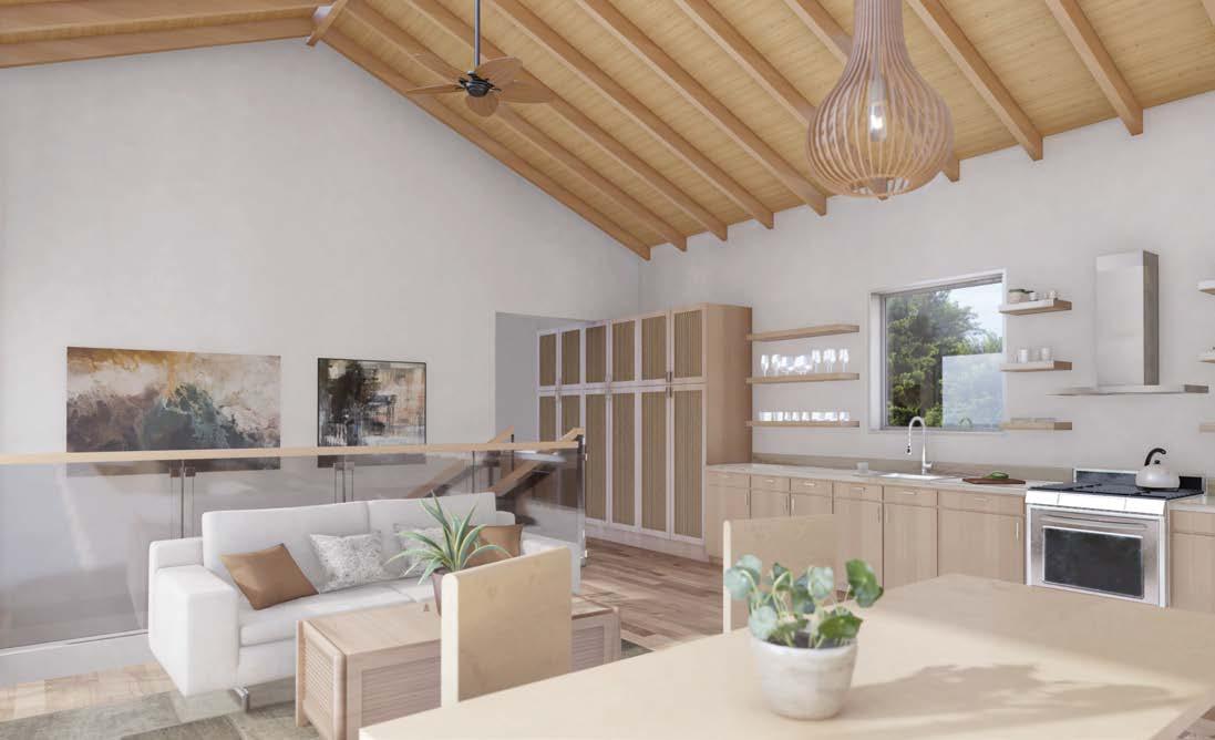 The interior kitchen area is open plan and offers ample space for creating meals and entertaining.