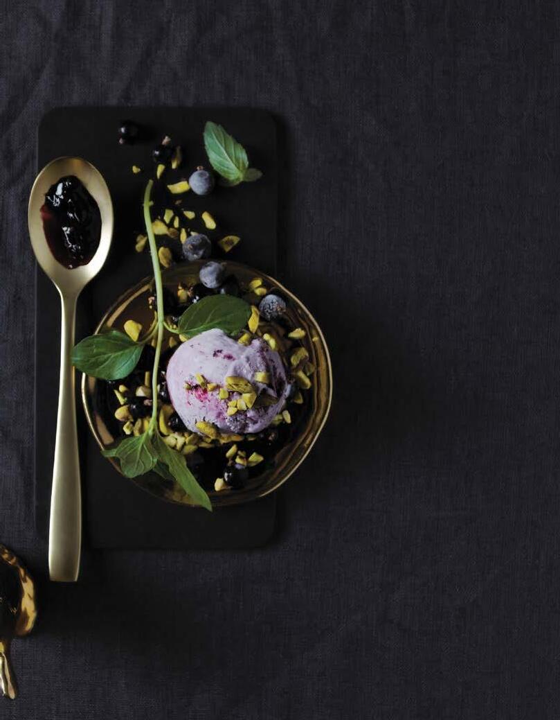 6. Remove bowl from freezer approximately 10 minutes prior to serving. Garnish servings with chopped pistachios, mint and extra jelly or preserve.