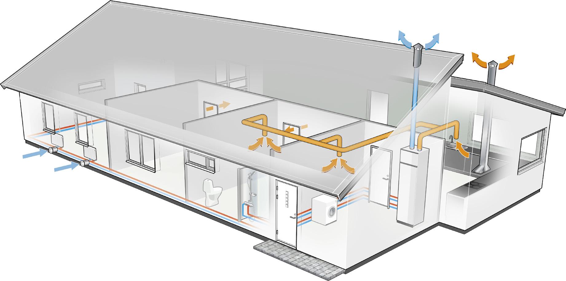 5. Uteluft tas in i huset via tilluftsventiler bakom radiatorerna där luften förvärms.