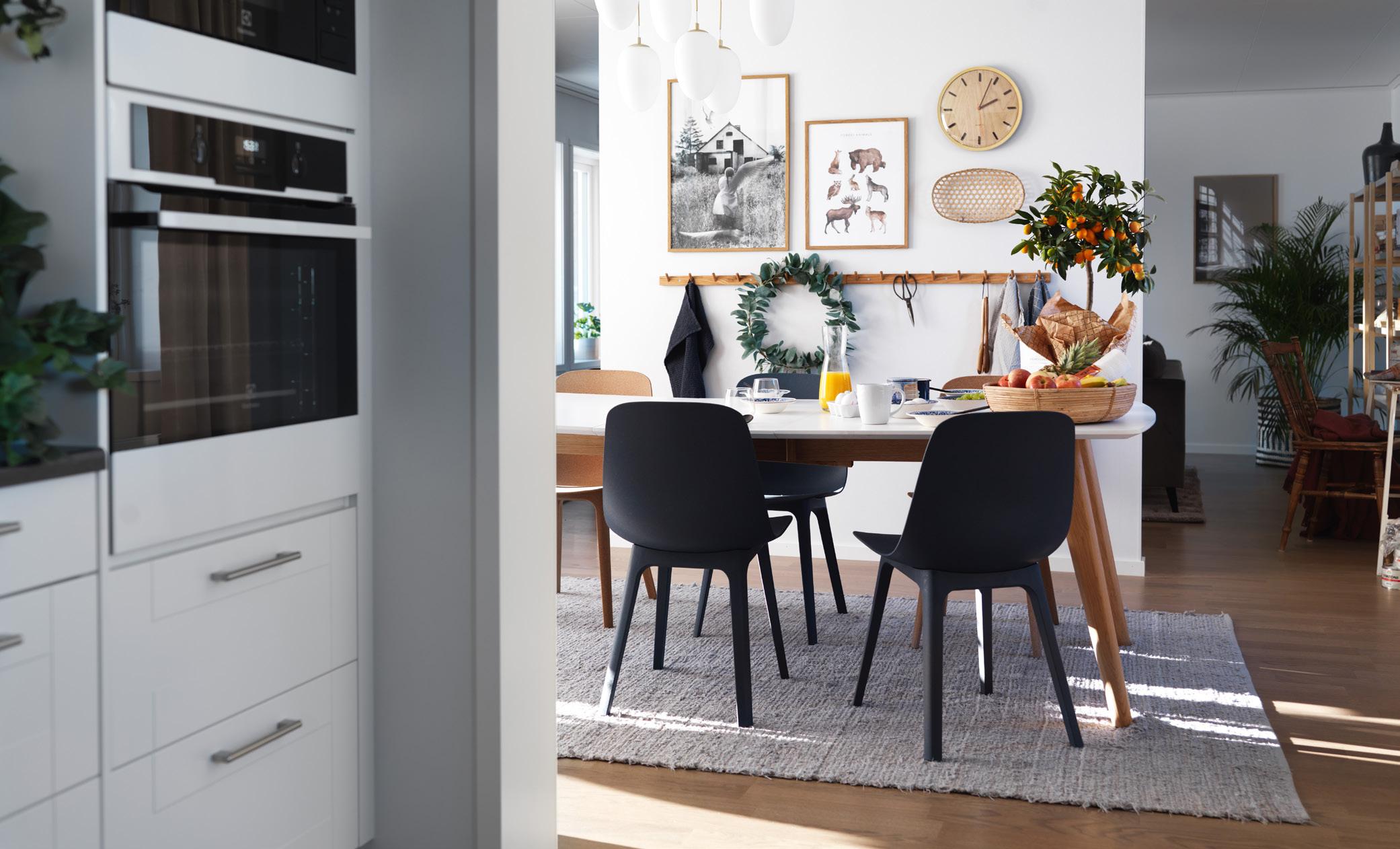 Textilier mjukar upp intrycket, ger en hemtrevlig känsla och dämpar dessutom ljudnivån i köket. Klä till exempel stolarna med fårskinnsfällar och skapa vardagsrumskänsla med en matta under köksbordet.