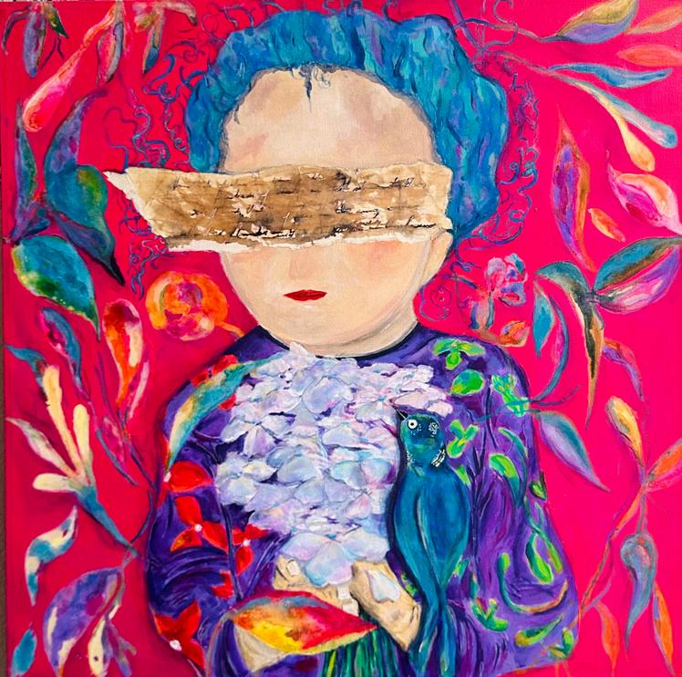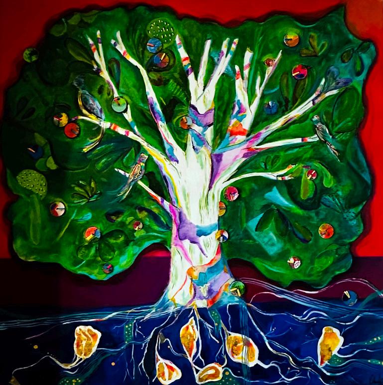 "Árbol de los Espíritus", es un espacio mágico que conecta el presente con el pasado. El árbol frondoso, situado en el centro de la obra, se rodea de pájaros y sombras, creando una atmósfera encantadora. Los colores vivos, las texturas y los elementos evocan un entorno donde lo extraordinario se entrelaza con lo cotidiano.