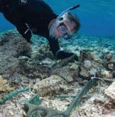 Our personnel were briefed, small boats were fuelled and the various teams were away almost as soon as the two main expedition vessels had moored up. Warren Delaney, a member of the Maritime Archaeological Association of Queensland and formerly with the Queensland Museum, had visited Wreck Reefs on several earlier expeditions, and he quickly located and buoyed the site of HMS Porpoise on the southern side of the Porpoise Cay lagoon.