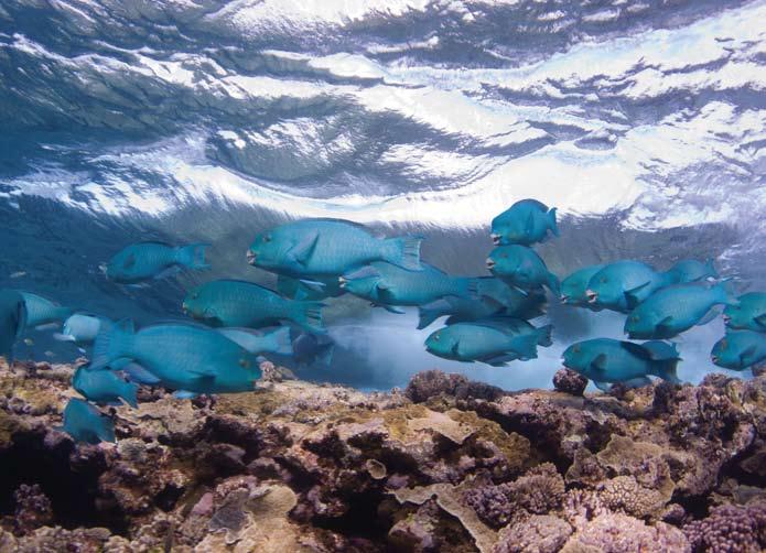 right: A school of Blue Parrotfish, also known as Mini-fin Parrotfish, on the southern edge of the Cato Gutter, Wreck Reefs.