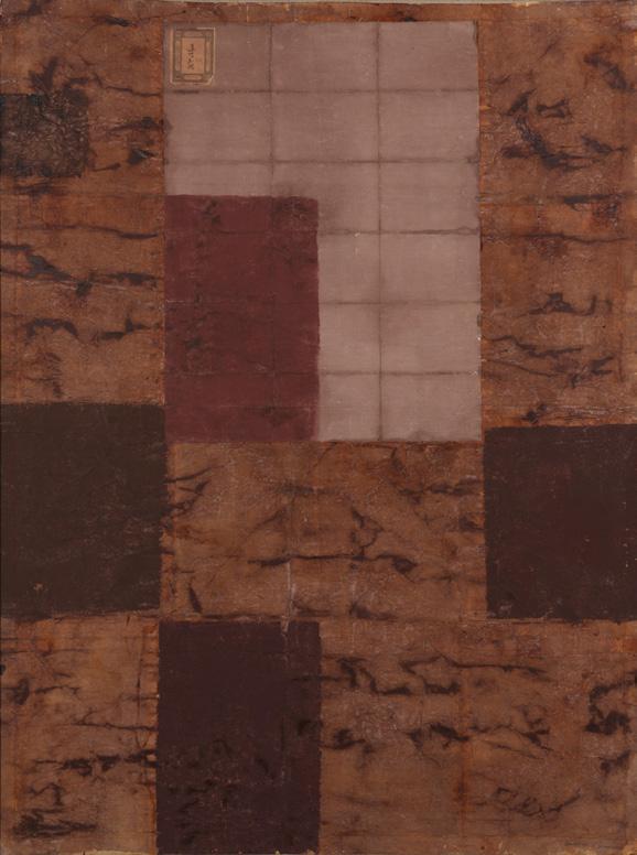 Composizione (early 50s) oil on board 14,33x13,5 in apocryphal signature lower right on the reverse: Figura, oil and tempera Associazione per il Patrocinio e la Promozione della Figura e dell'Opera di Mario Sironi, Milan, n. 156/21 RA