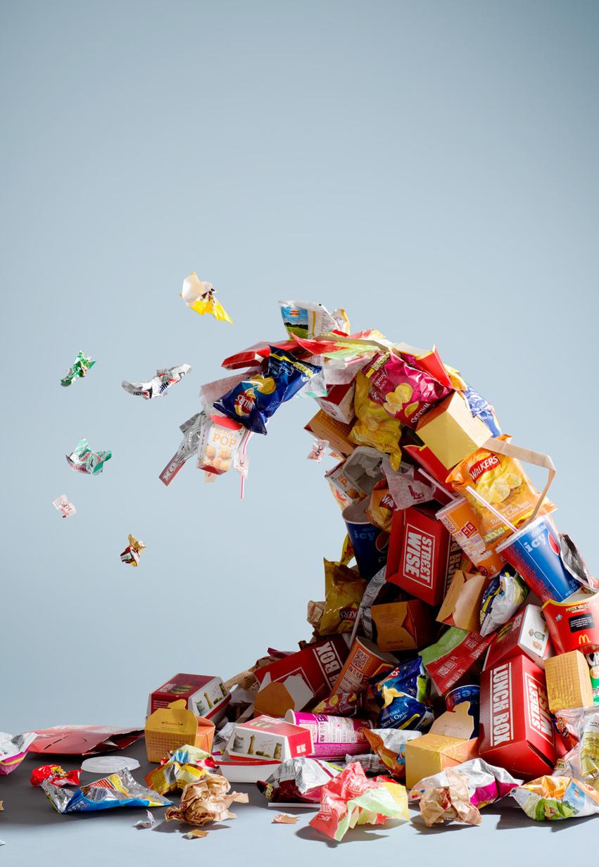 The dramatic sea of plastic depicted in the image was gathered from just two weeks of waste from ten households, all of which was recycled postshoot to ensure zero contribution to landfill